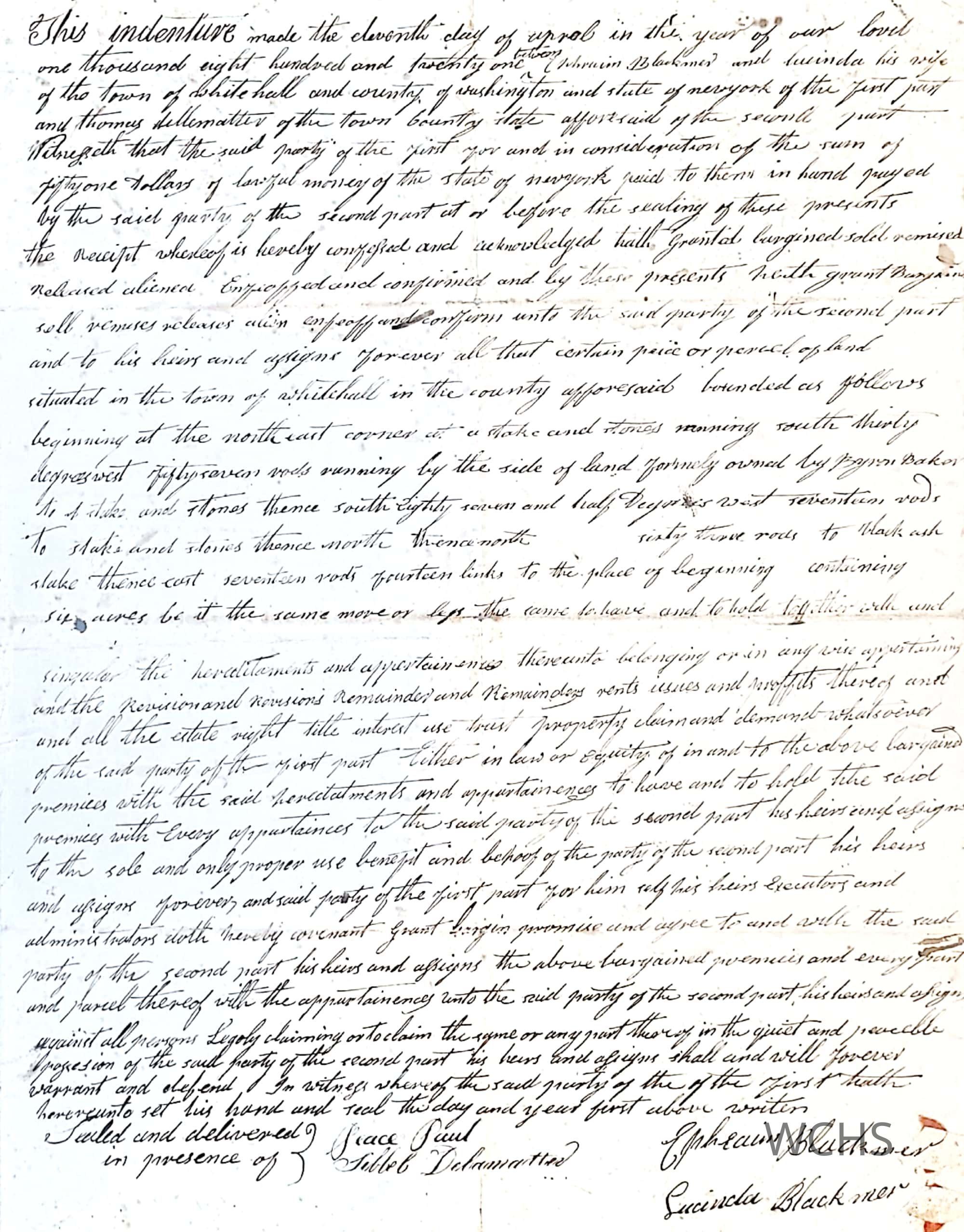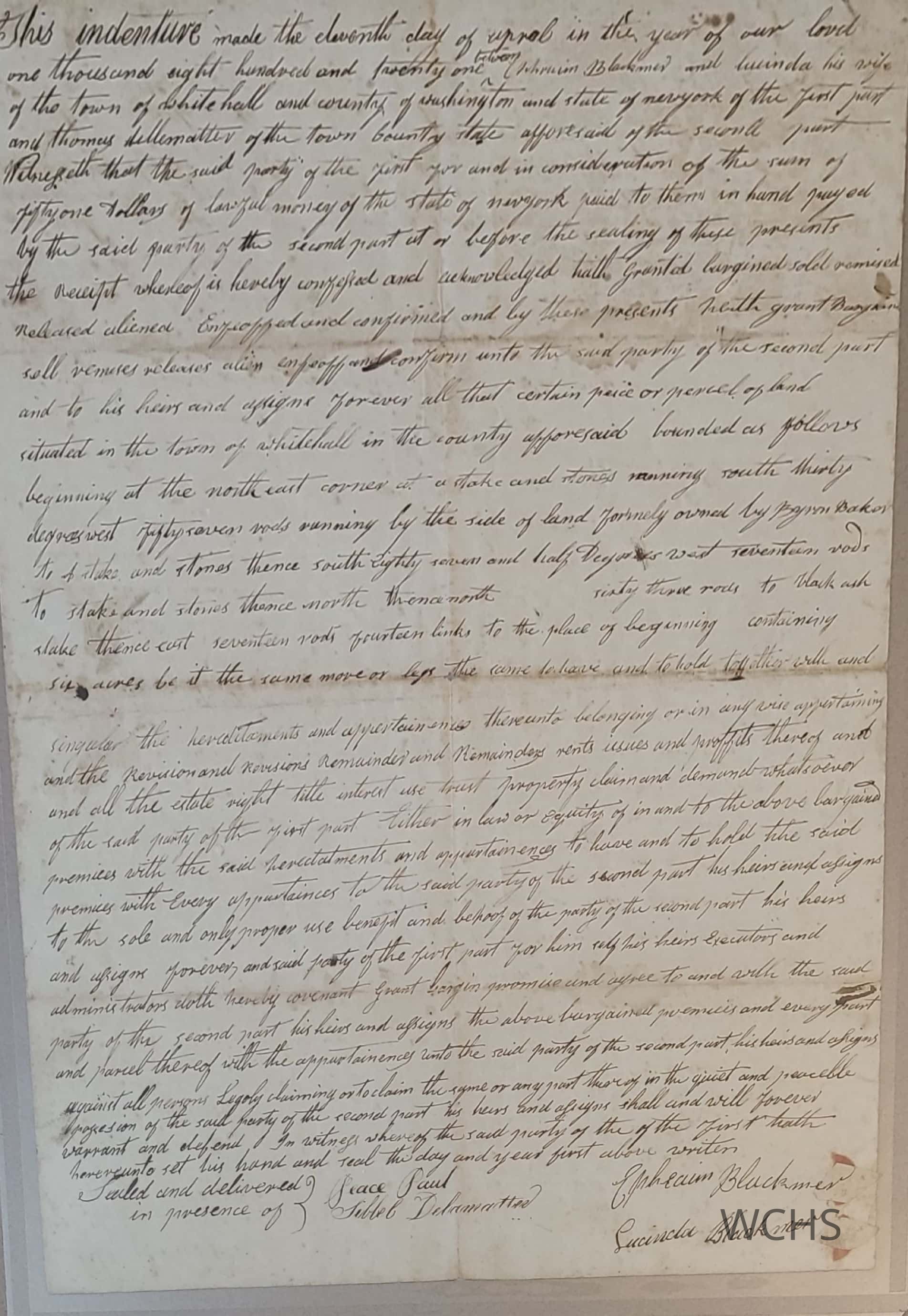 1821 Land Indenture between Ephraim Blackmer and Lucinda Blackmer of Whitehall, NY and Thomas Dellematter of Whitehall, NY. Others mentioned: Peace Paul and Sibbel Delamatter