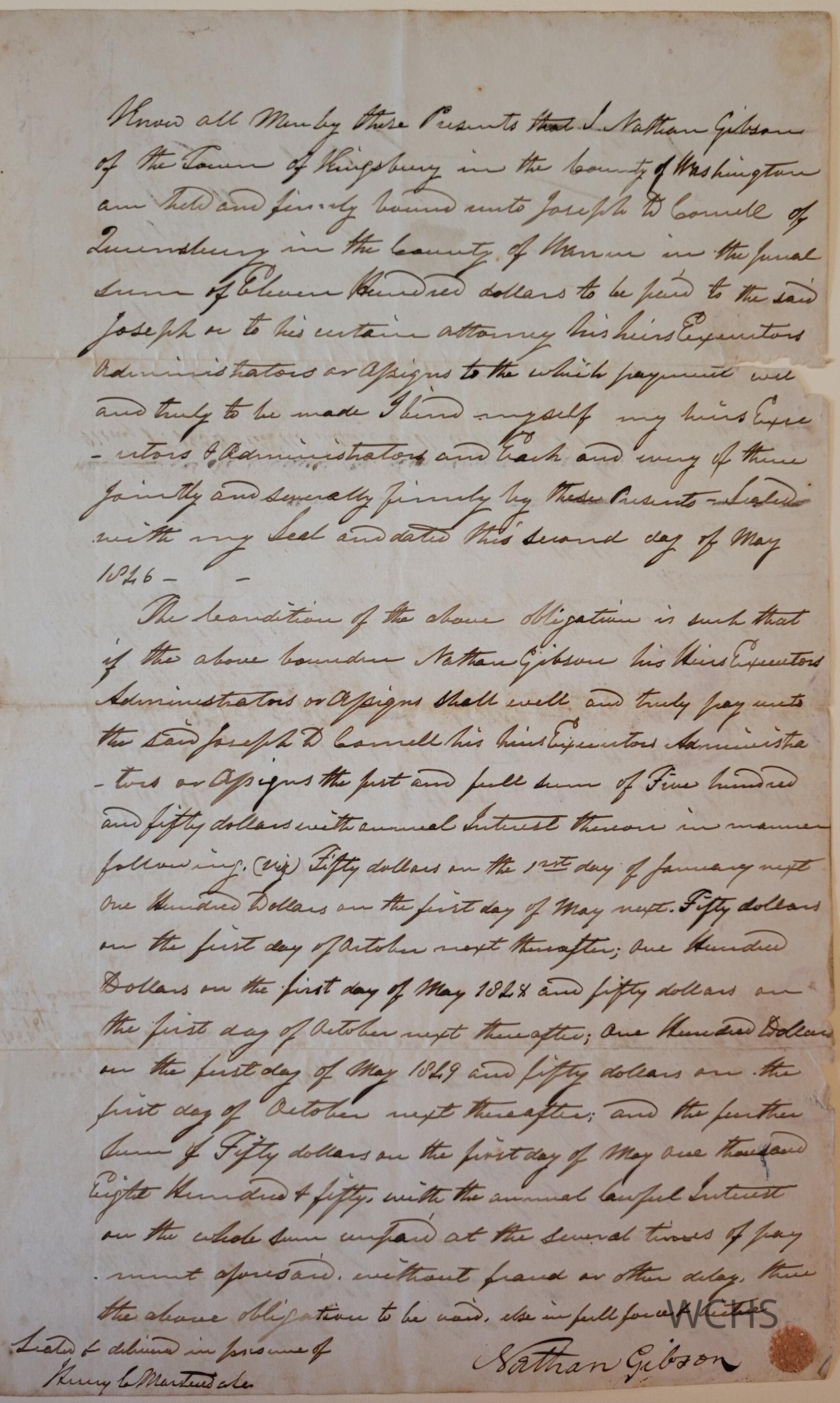 This bond indenture dated 2 May 1826 lays out the payment schedule between Nathan Gibson of Kingsbury, New York to Joseph D. Cornell of Queensbury, New York.