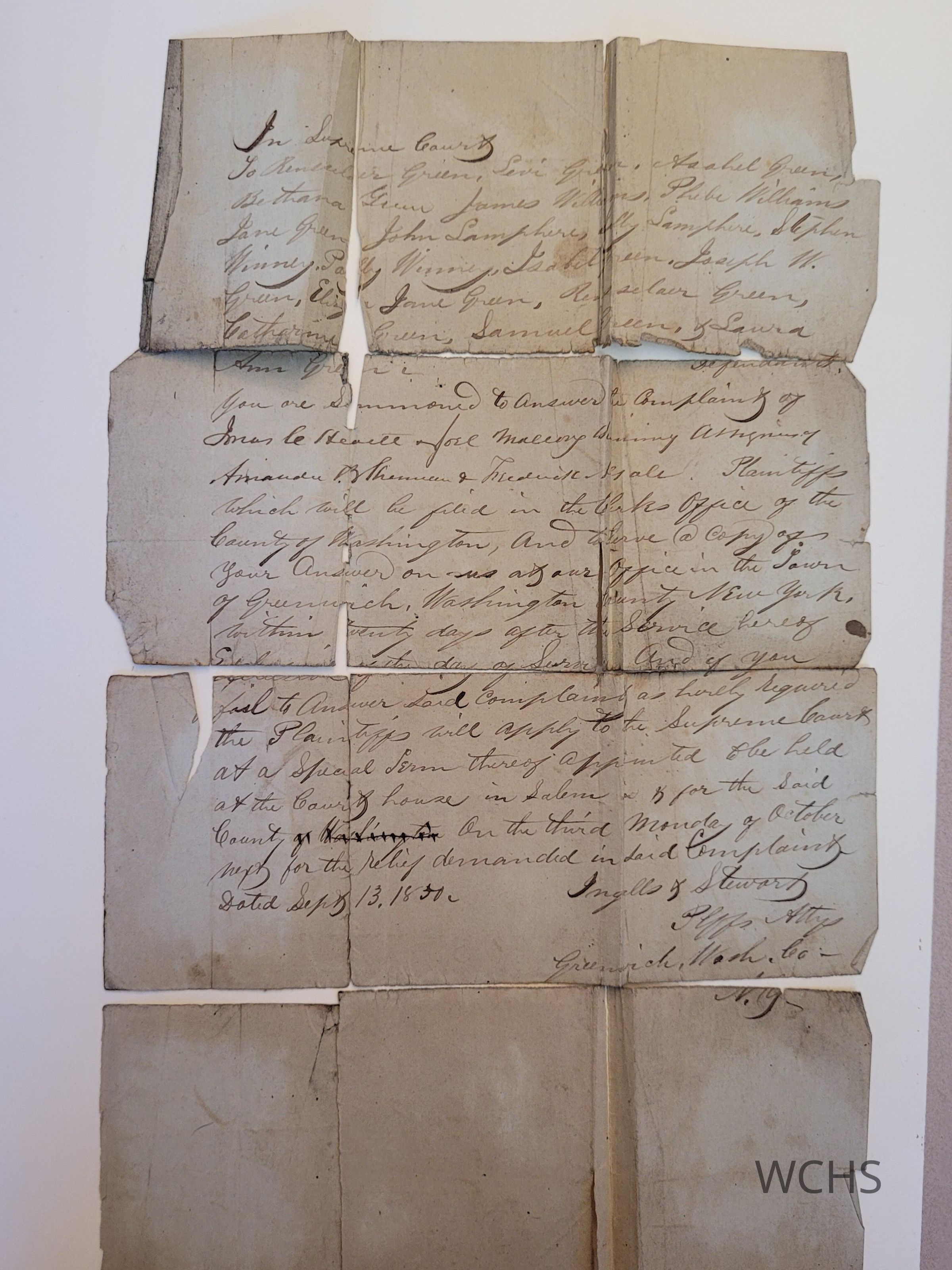 Which will be filed in the Clerks office of the county of Washington, and to serve @ copy of your answer on us at our office the Town of Greenwich, Washington County New York within twenty days after the Service hereof. Exclusive of the day of Service and if you fail to answer said complaint as [unknown] required the Plaintiffs will apply to the Supreme Court at a Special term thereof appointed [unknown] held at the Courthouse in Salem and for the said County (crossed out- “of Washington”) on the third Monday of October next for the relief demanded in said Complaint.