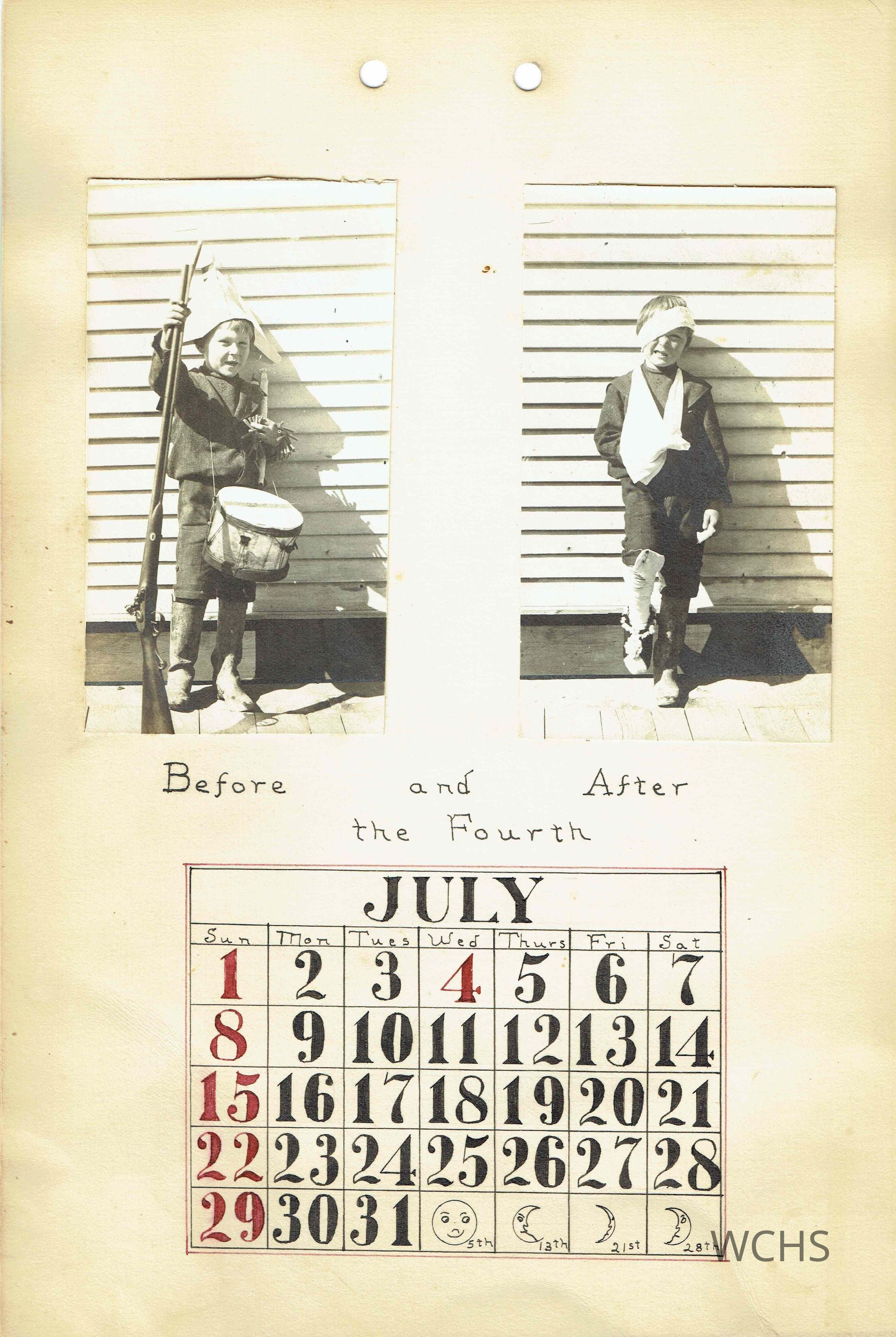 July- Two Pictures the first of a young boy holding a long rifle and wearing a hat and drum, the second of the same boy in a arm sling, head wrap and leg bandage with the caption " Before and After the Fourth"