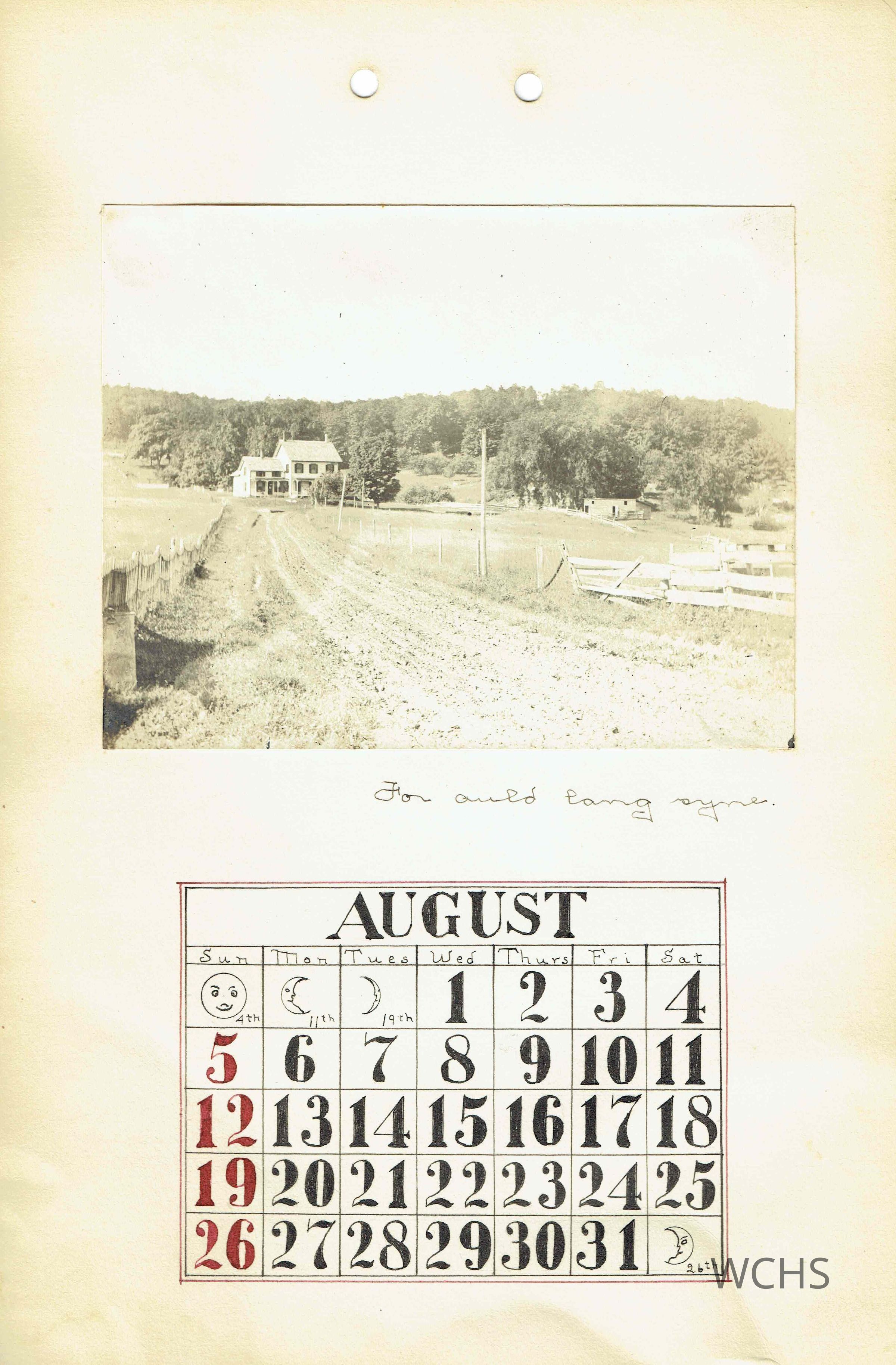 August- Picture of a farmhouse from a distance with the caption "For auld lang syne"