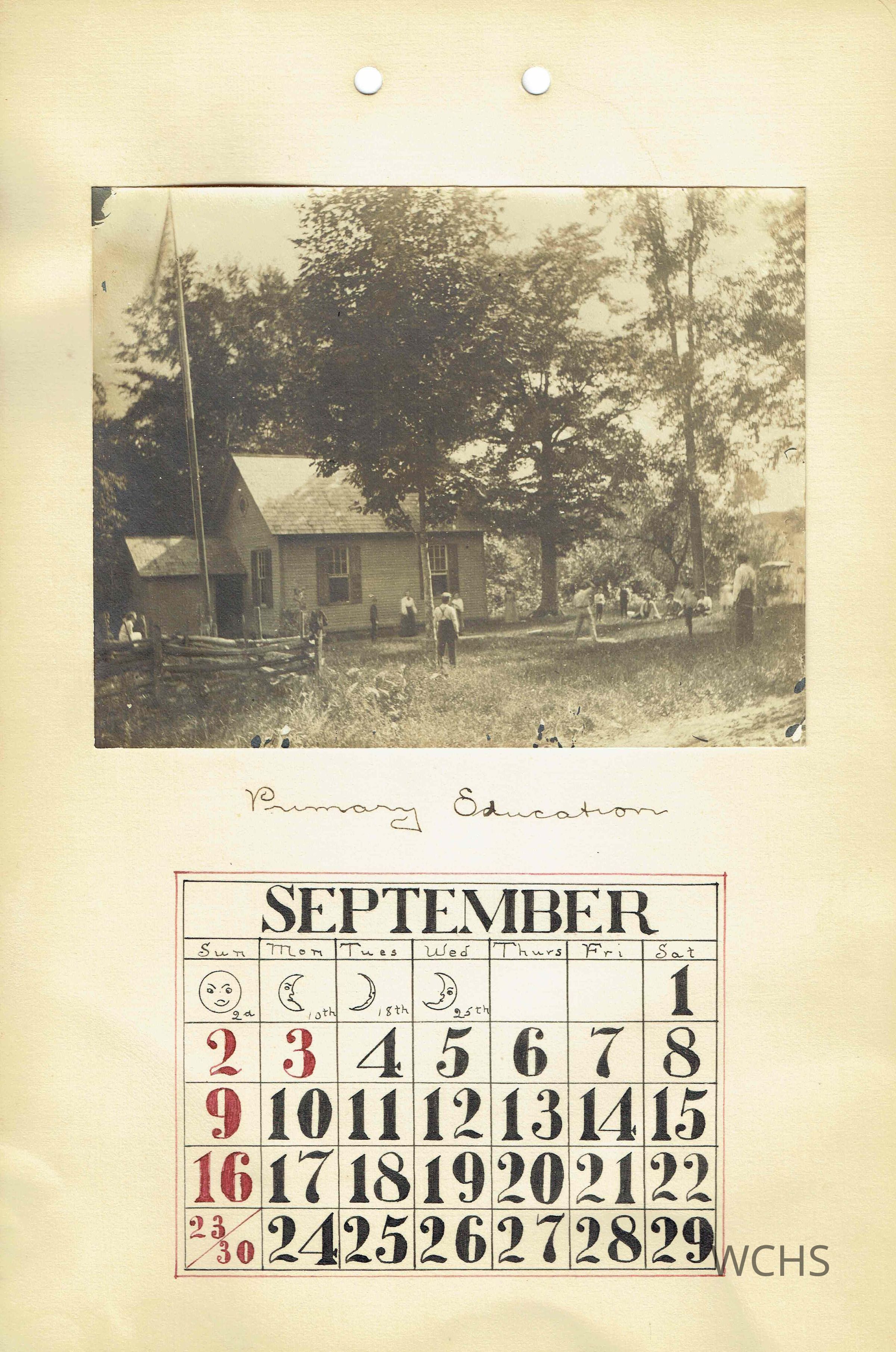 September- Picture of the Old Mill Bay School House with the caption "Primary Education"