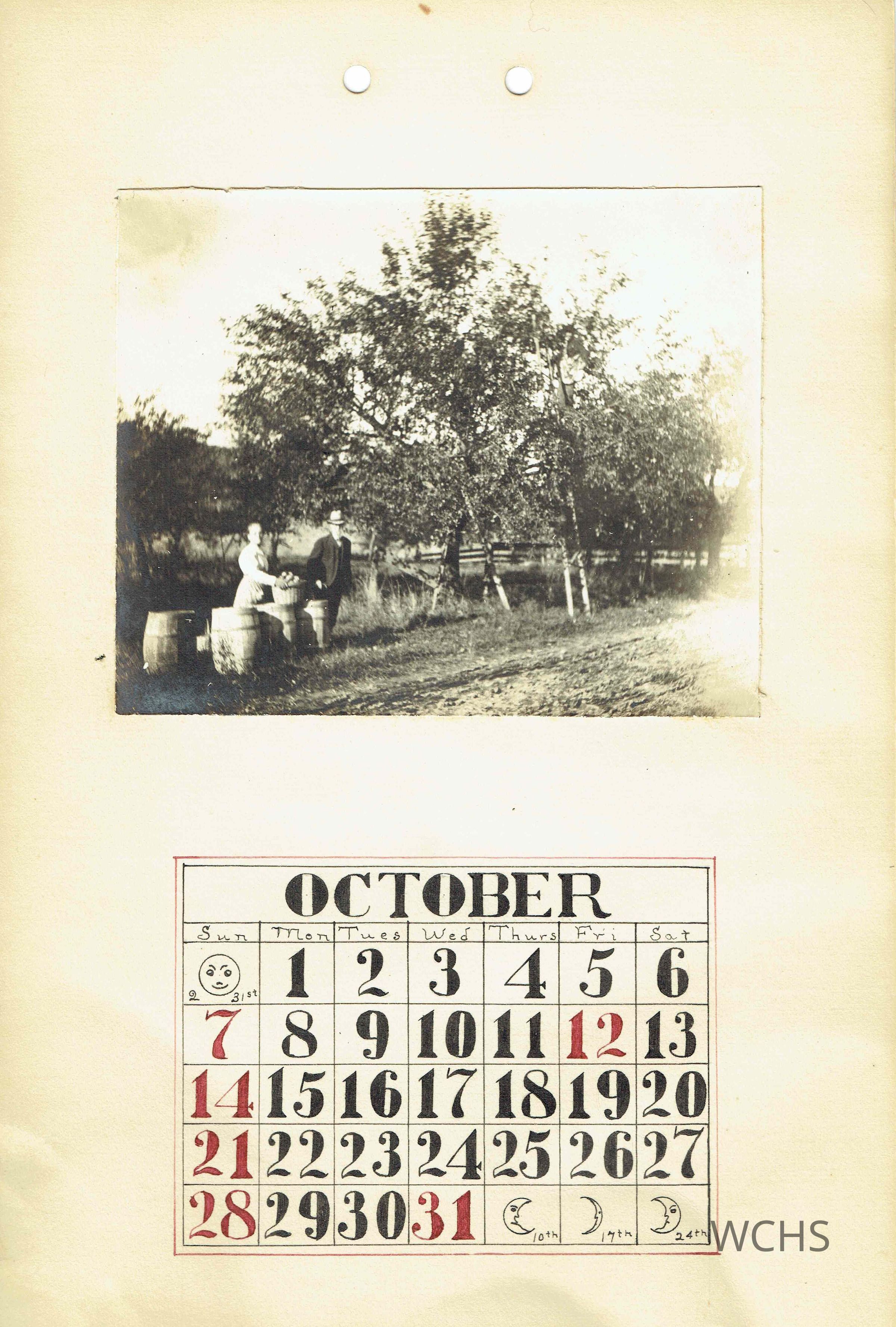 October- Picture of a man and women with apple bushels in an orchard