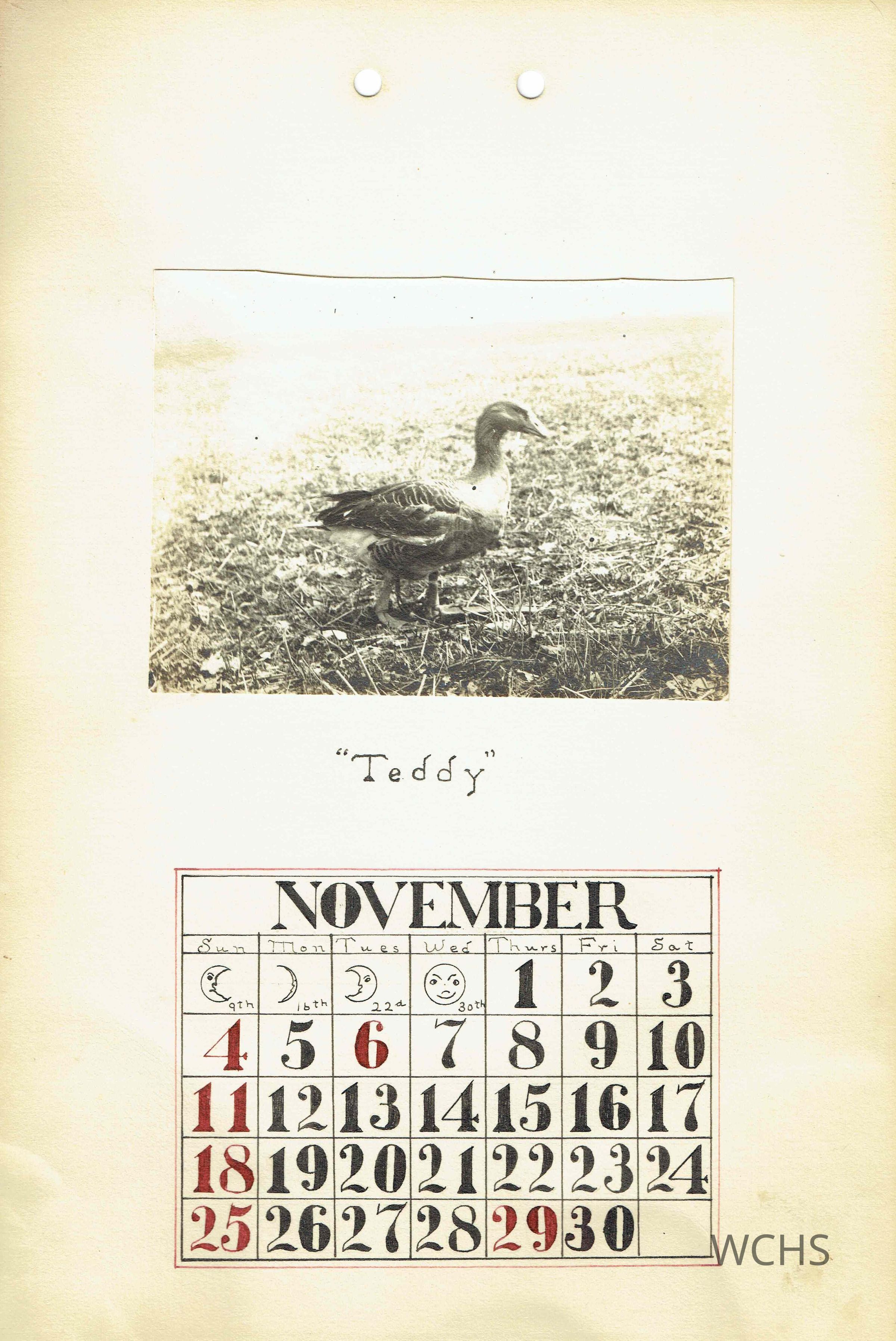 November- Picture of a duck in a field with the caption "Teddy"