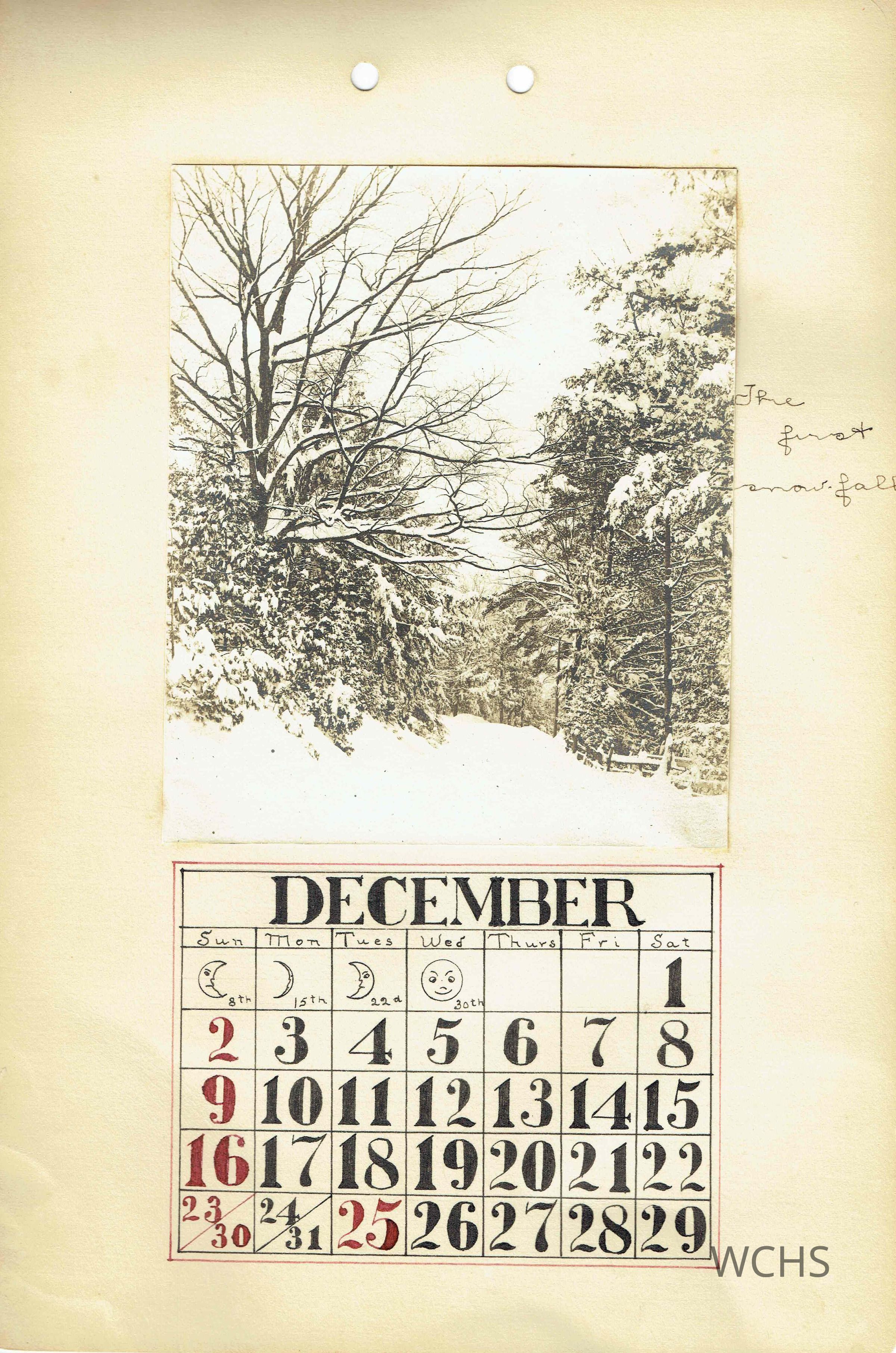 December- Picture of snow covered trees with the caption "The first snowfall"