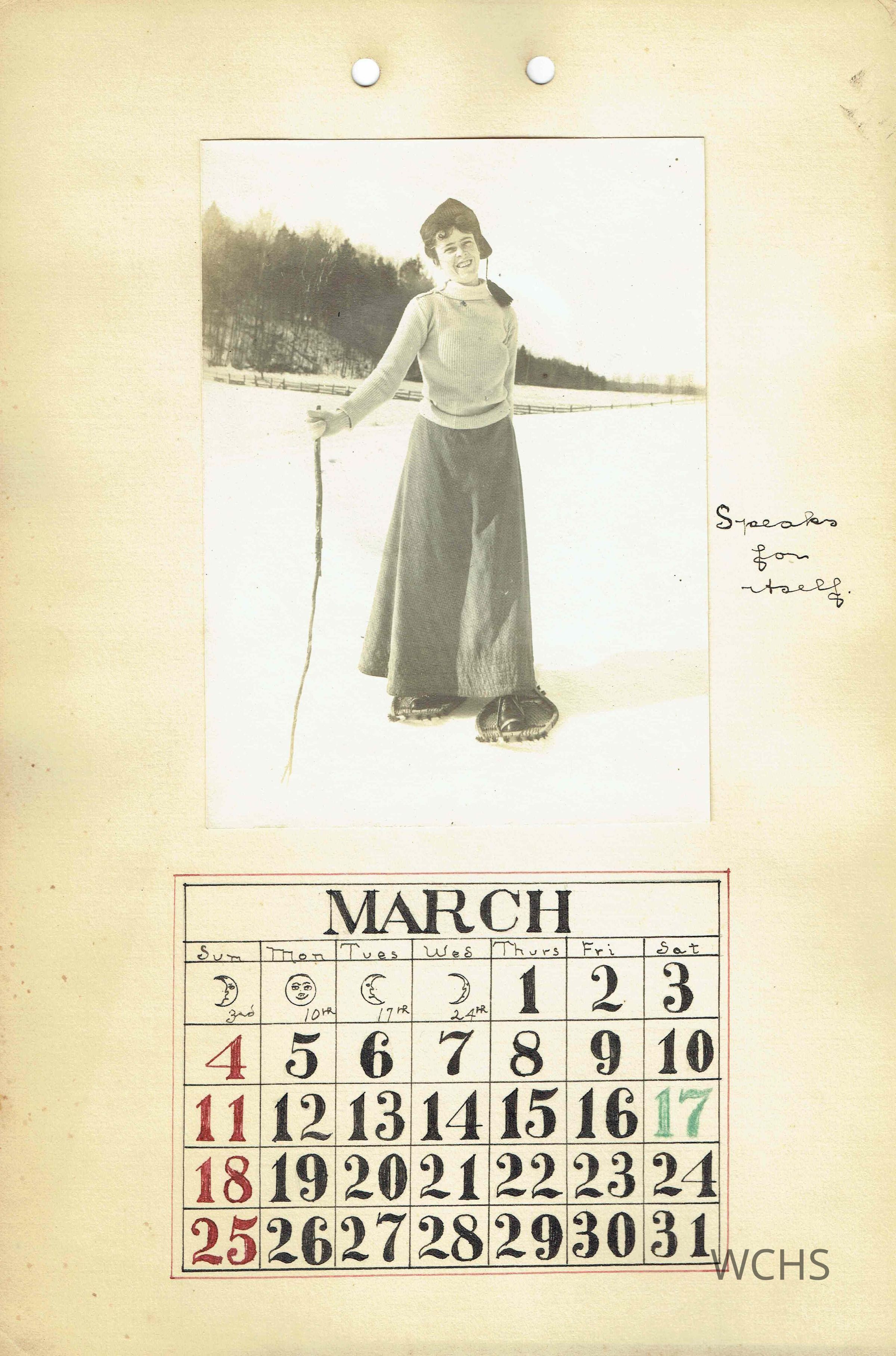 March- Picture of a young woman snow shoeing in a fashionable skirt and sweater with caption "Speaks for itself"