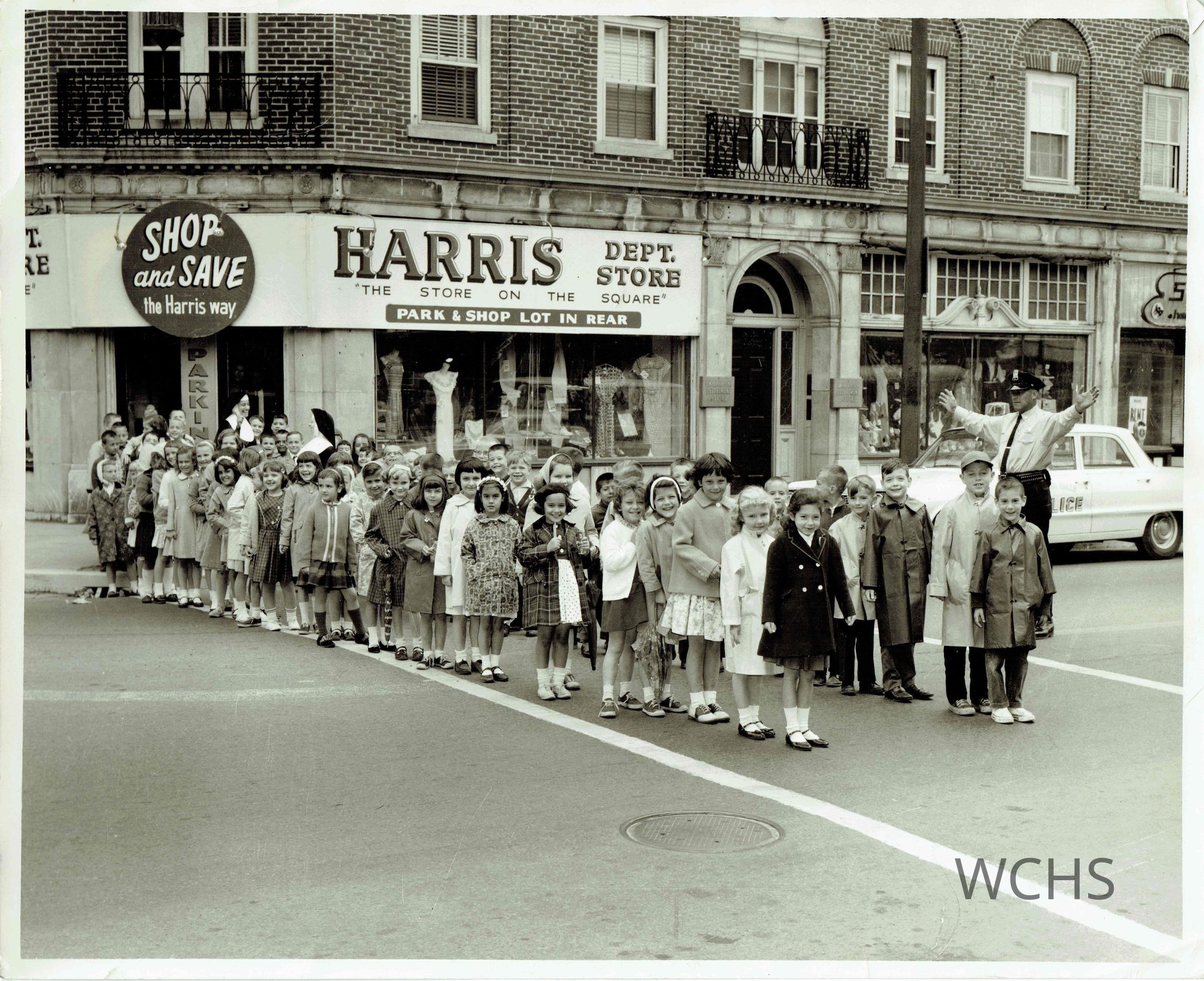 Students of St Mary's- St. Paul's of Hudson Falls, New York Cross the Street with help of Patrolman Ernie Bercette. Harris Department Store shown in the background.
