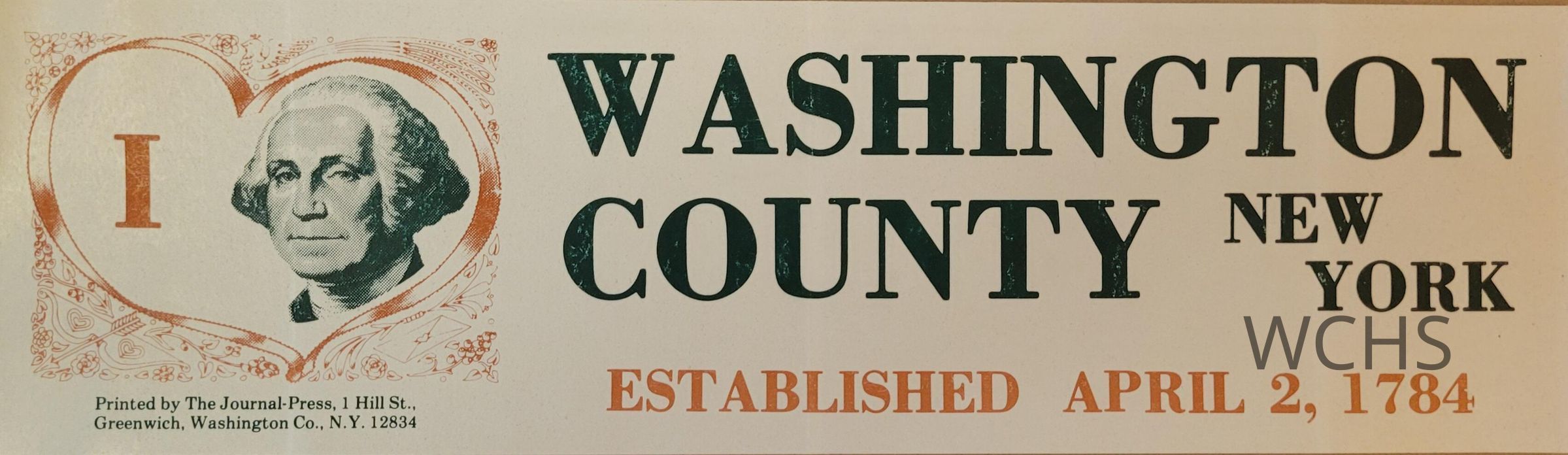 In 1984 this bumper sticker was created to honor of the 200 year anniversary of Washington County. Printed by The Journal-Press, 1 Hill Street. Greenwich, Washington Co. NY. unused.