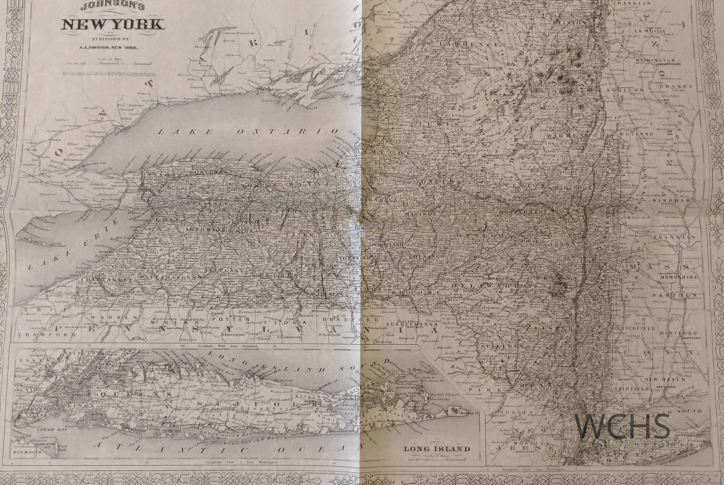 2. New York State 1866 showing town boundaries which help locating railroads, settlements and transportation routes (18" x 24") and