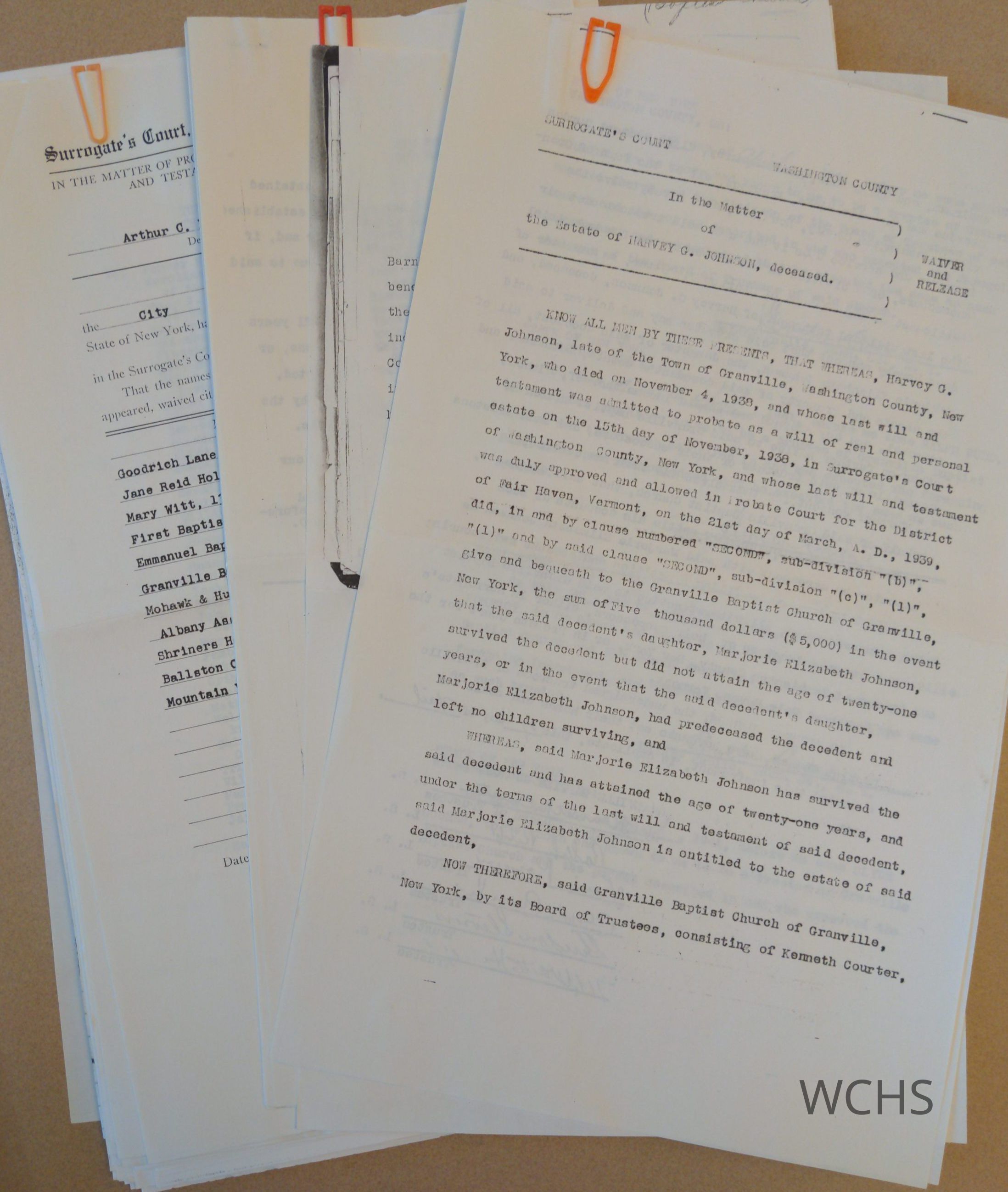 Surrogate's Court Waiver and Release of Harvey G. Johnson. Named individuals; daughter - Marjorie Elizabeth Johnson, Church Trustees - Kenneth Courter, Ralph Rudd, Lewis Pomeroy, Clyde Coomer, Gurdon Stevens, N. Waite Hicks, Executor Charles W. Potter. Show Cause document naming; Freeda Pember, Wells Cemetery Improvement Association, Marca A. Pember, Silas E. Everts, Administrator of Irving Wynkoop estate, John H. Pember Executor for Inez Pember, Pember Library and Museum, Mettowee Valley Cemetery Association, Baptist Church of Granville, NY, Welsh Congregational Church aka Jerusalem Congregational Church, Trinity Episcopal Church, Village of Granville, NY, Pember Foundation for the Village of Granville Clara Pember Duel and Pember Library and Museum Foundation.