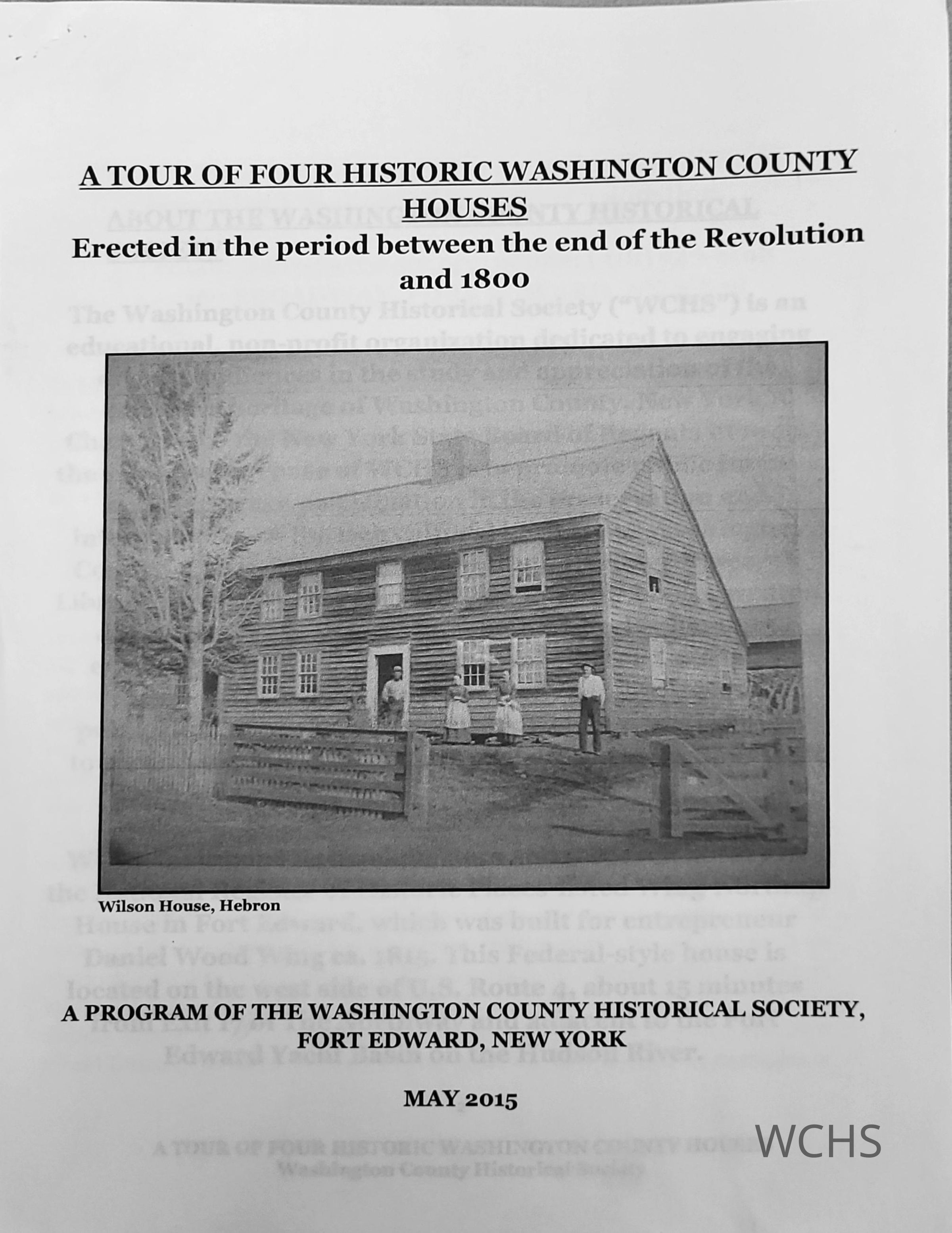 This pamphlet was published in 2015 as an accompaniment to the WCHS-sponsored "A Tour of Four Historic Washington County Houses," a tour and fundraiser conducted on May 30, 2015. The information contained herein was largely researched and written by William E. Krattinger, a WCHS trustee and employee of New York State's Division for Historic Preservation.
