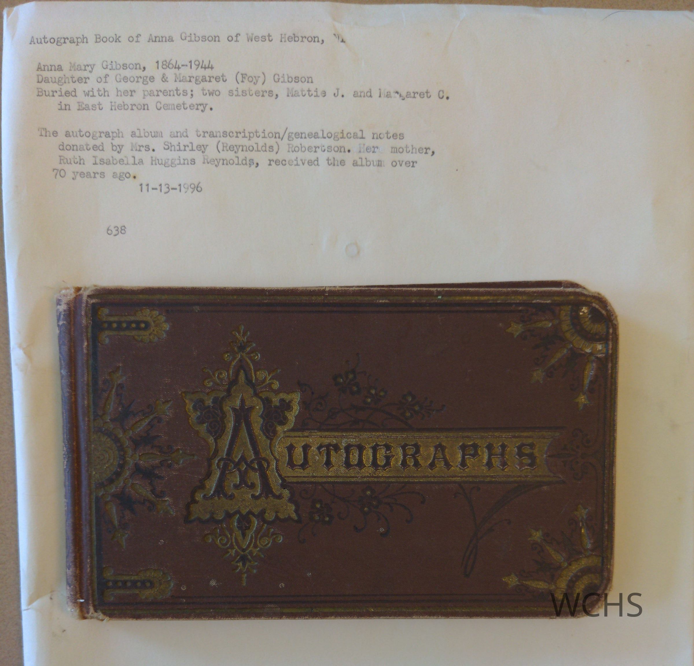 The autograph album and transcription/genealogical notes donated by Mrs. Shirley (Reynolds) Robertson. Her mother Ruth Isabella Huggins Reynolds received the album over 70 years ago. 11-13-1996