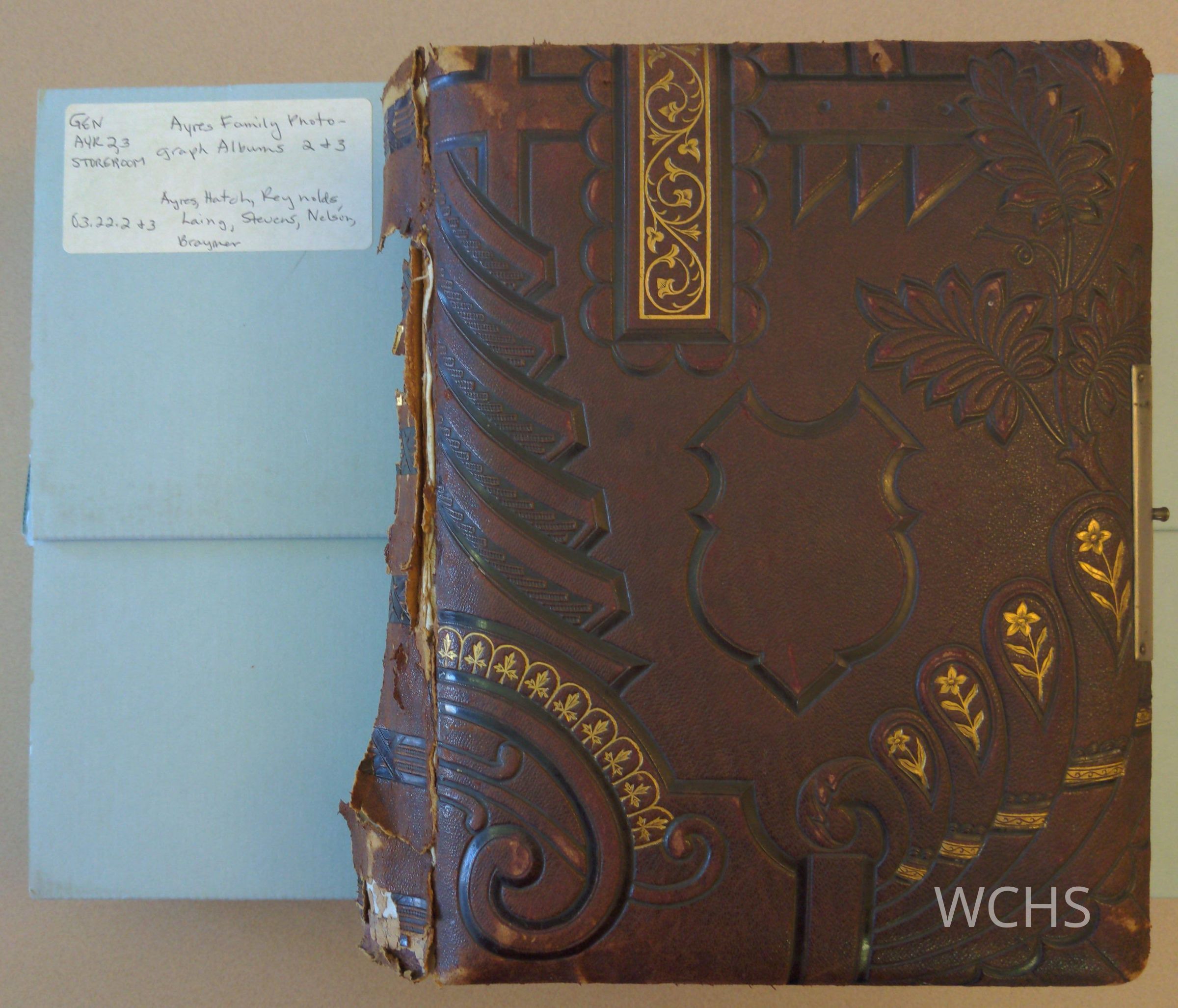 Brown leather album, 8 1/2" X 10 1/2". Sepia photographs, located in storeroom.