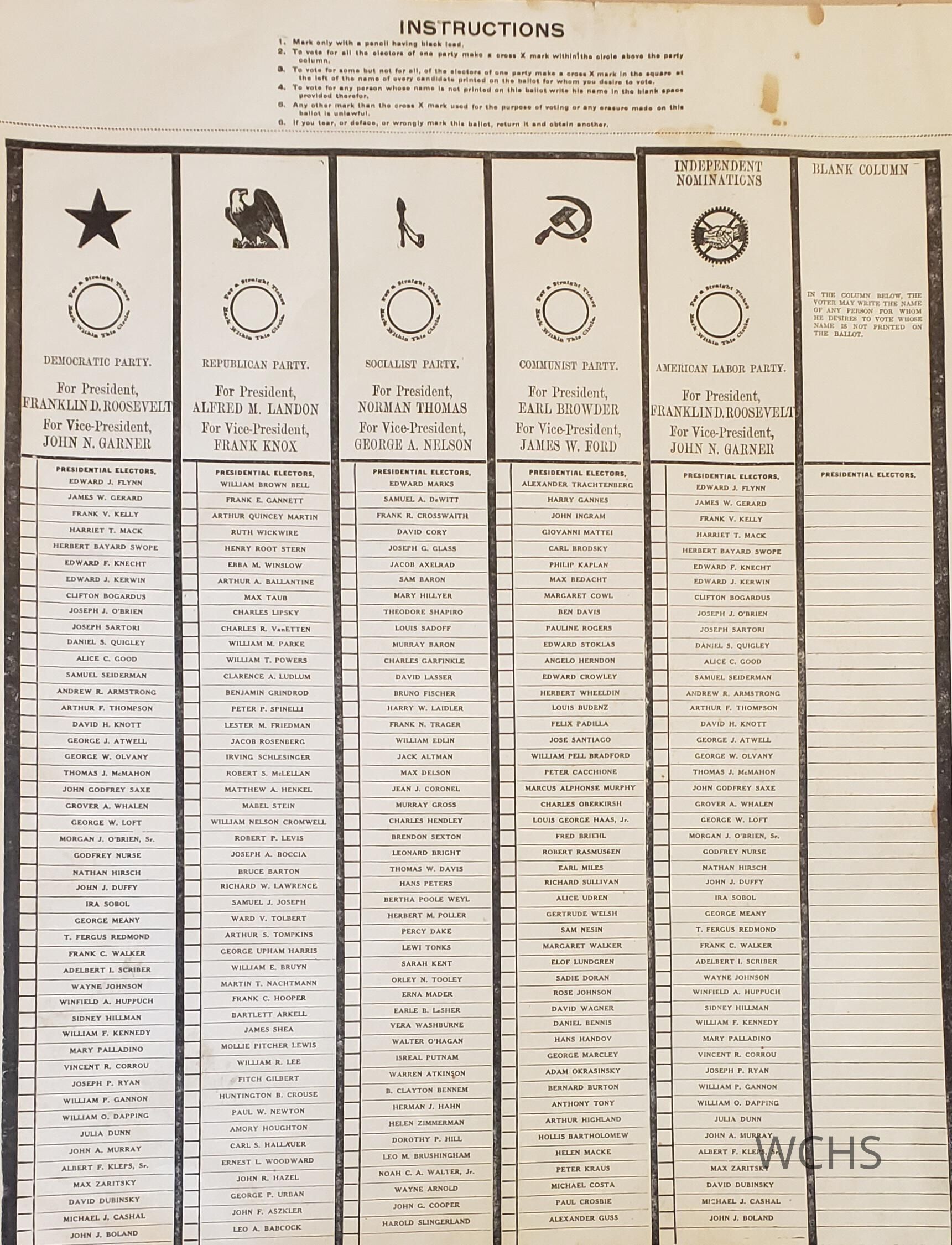 Official Ballot for Presidential Electors County of Washington Town of Cambridge, Second Election District, November 3, 1936
