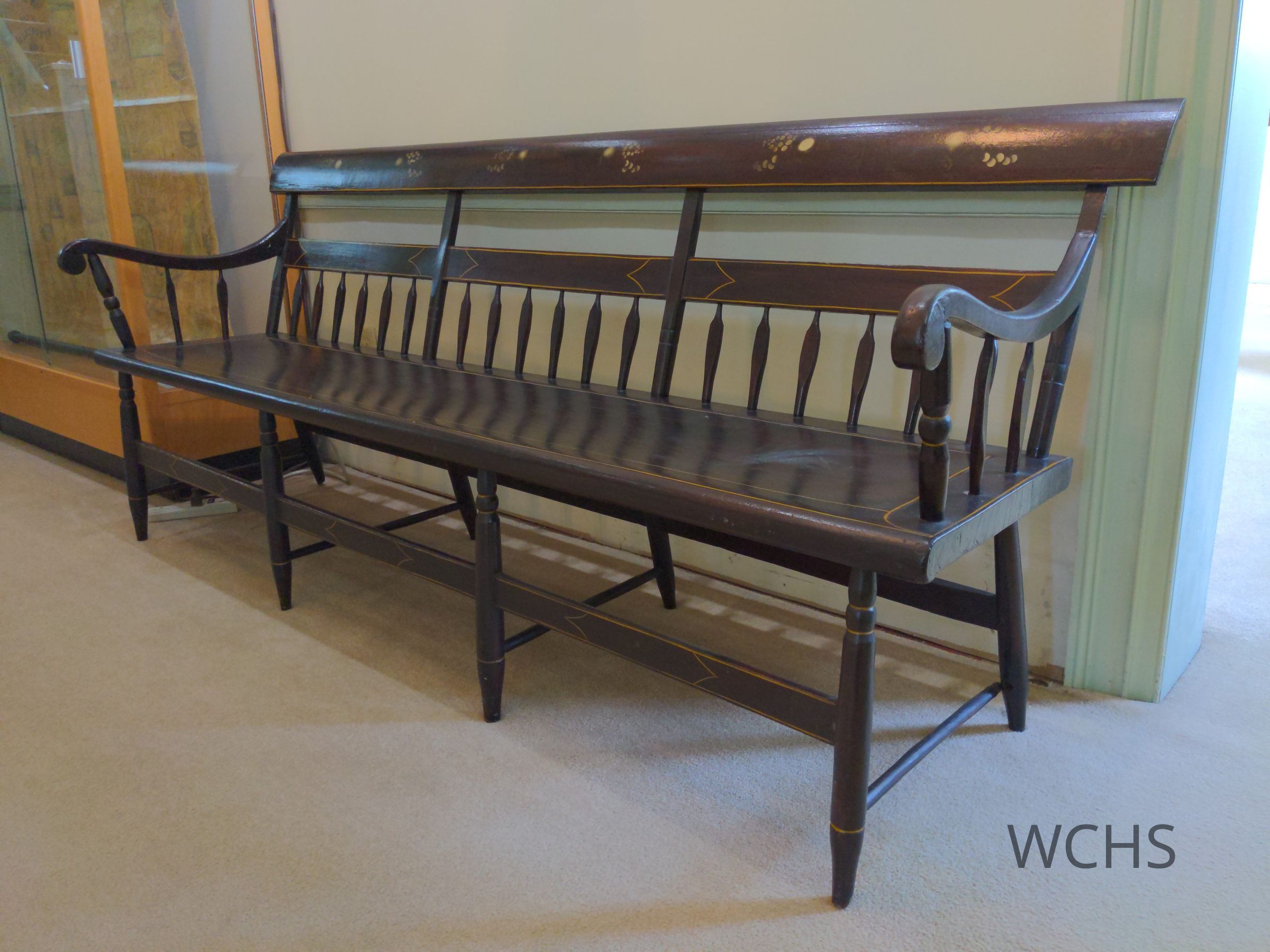 This bench was inheited by WCHS from the Charles Horuff estate. It is used in our meeting room or parlor. 81" long. Black wood. gold trim.