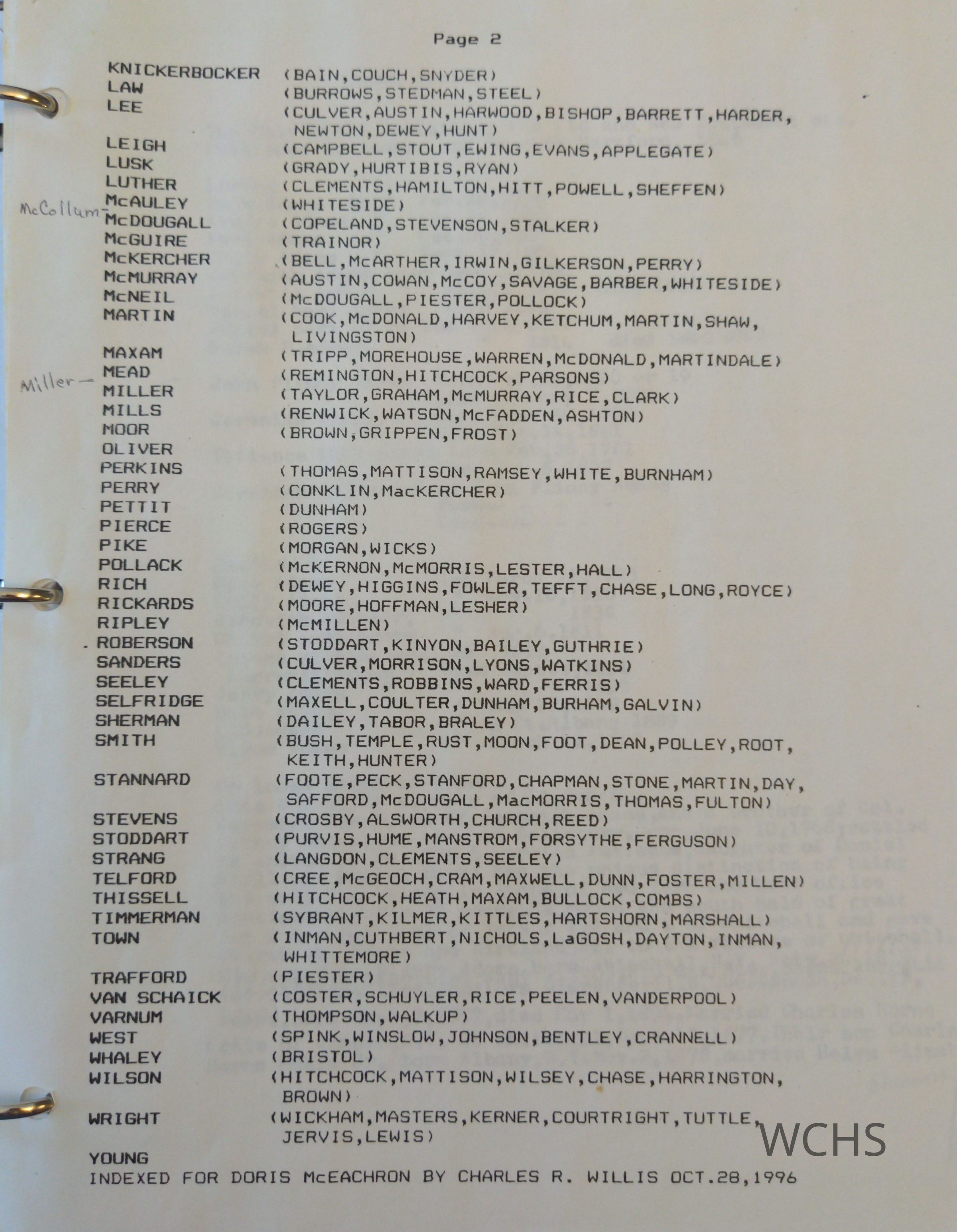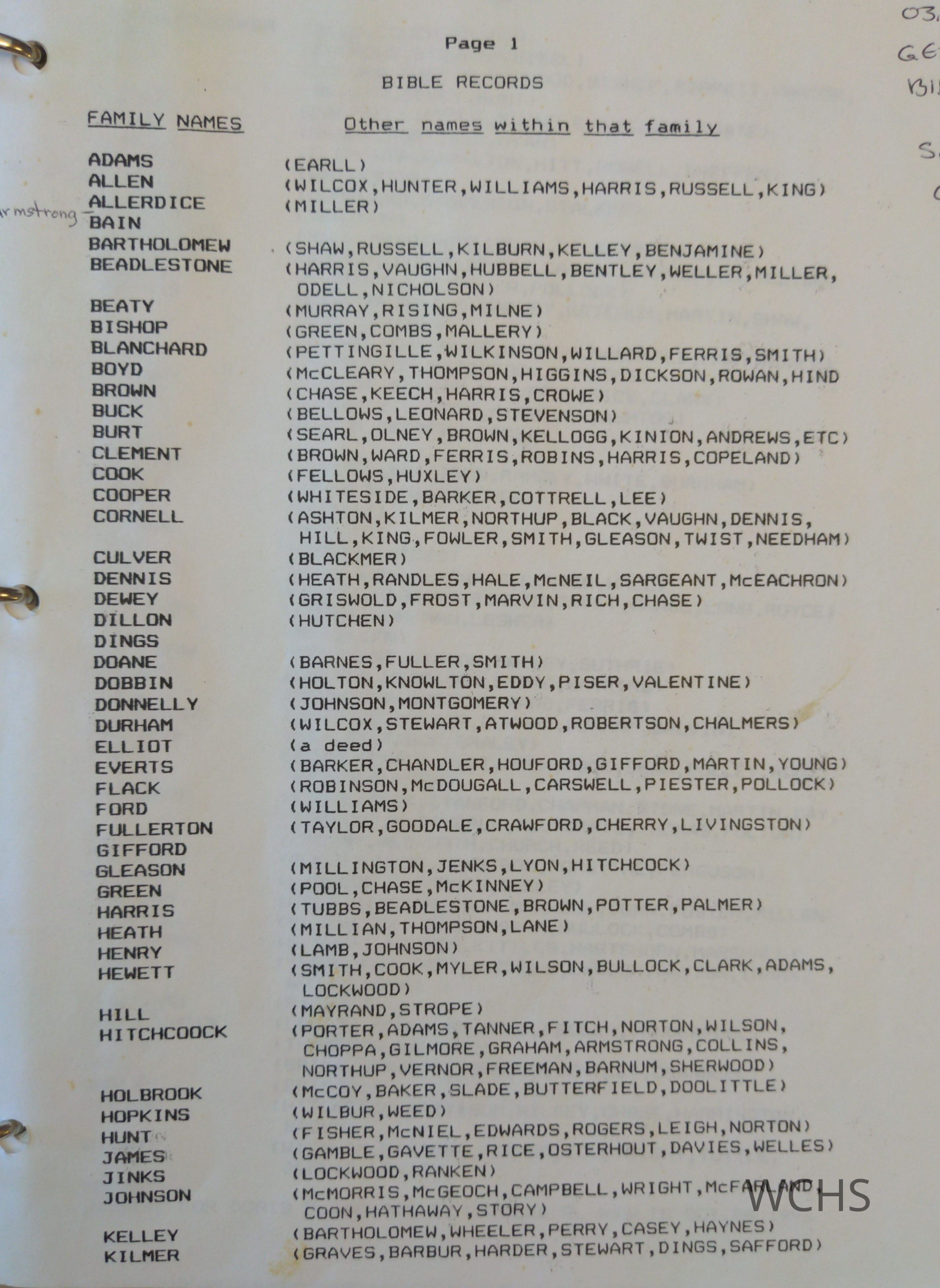 Family names that are included are Adams, Allen, Allerdice, Armstrong, Bain, Bartholomew, Beadlestone, Beaty, Bishop, Blanchard, Boyd, Brown, Buck, Burt, Clements, Cook, Cooper, Cornell, Culver, Dennis, Dewey, Dillon, Dings, Doane, Dobbin, Donnelly, Durham, Elliot, Everts, Flack, Ford, Fullerton, Gifford, Gleason, Green, Harris, Heath, Henry, Hewett, Hill, Hitchcock, Holbrook, Hopkins, Hunt, James, Jenks, Johnson, Kelley, Kilmer, Knickerbocker, Law, Lee, Leigh, Lusk, Luther, McAuley, McCollum, McDougall, McGuire, McKercher, McMurray, McNeil, Martin, Miller, Mills, Oliver, Perkins, Perry, Pettit, Pierce, Pike, Pollack, Rickards, Roberson, Robertson, Robinson, Sanders, Seeley, Selfridge, Sherman, Smith, Stannard, Stevens, Stoddart, Strang, Telford, Timmerman, Town, Trafford, Van Schaick, Varnum, West, Whaley, White, Wilson, Wright, Young.