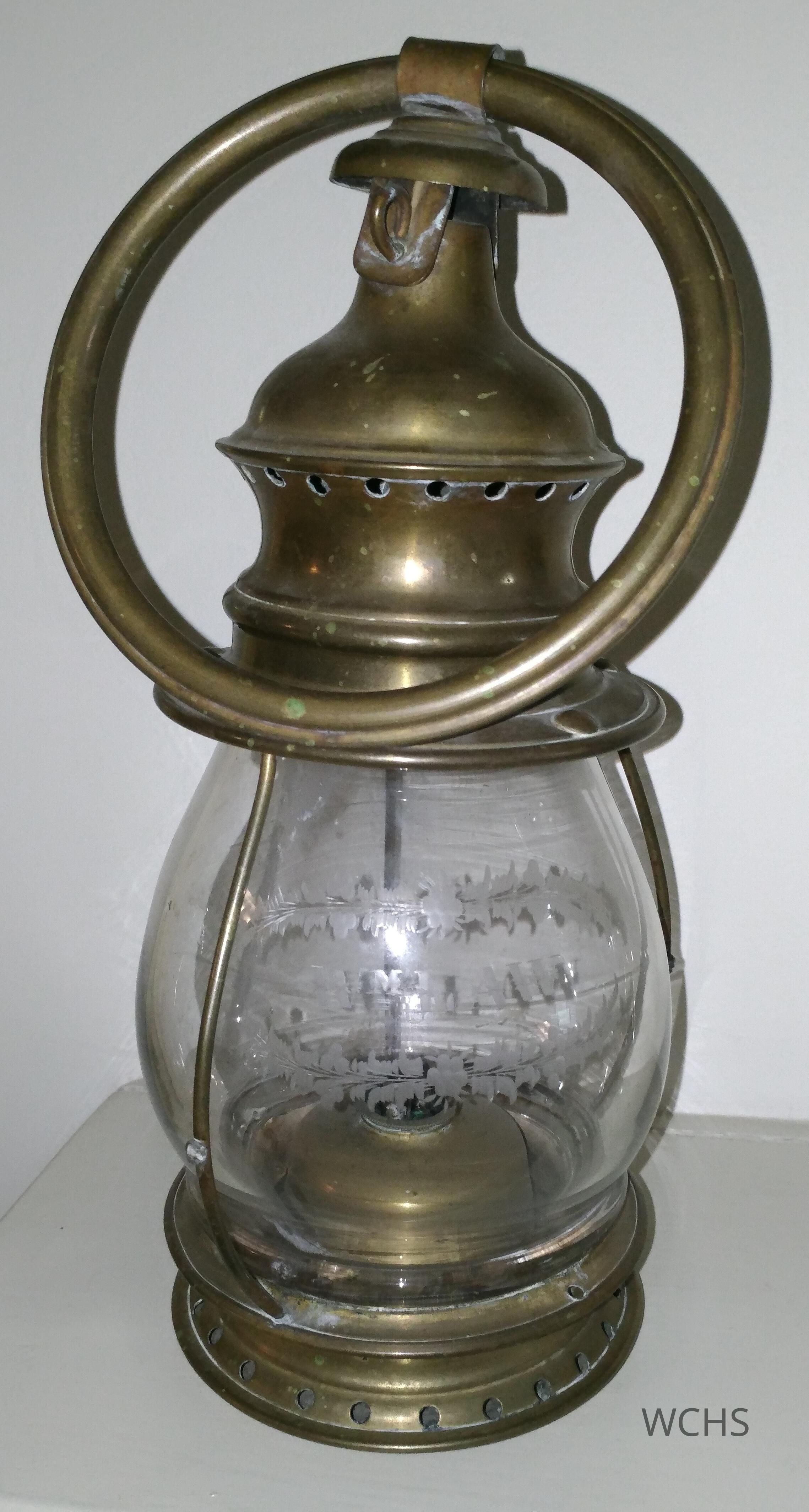 Brass and glass kerosene lantern 11" high, 16 " high with handle Etching is Wm. LAW