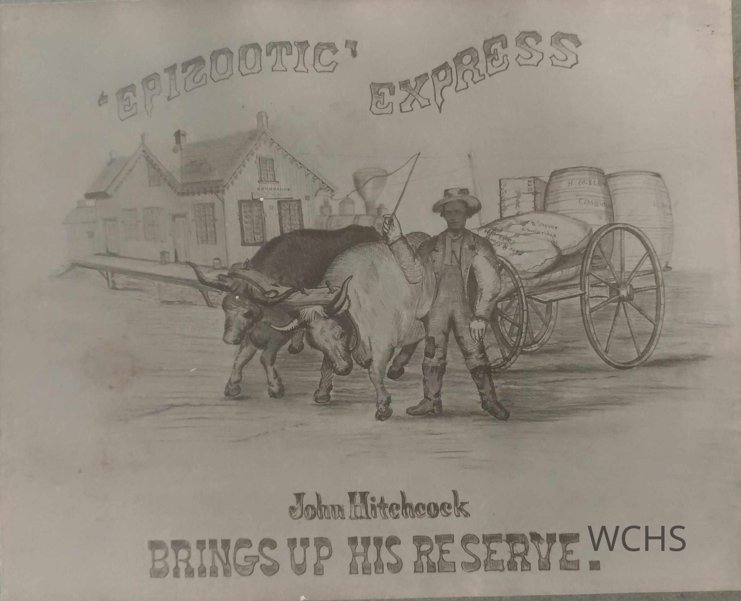 Drawing of "'Epizootic' Express, John Hitchcock Brings Up His Reserve." meaning of drawing unknown. Nothing on reverse of picture.