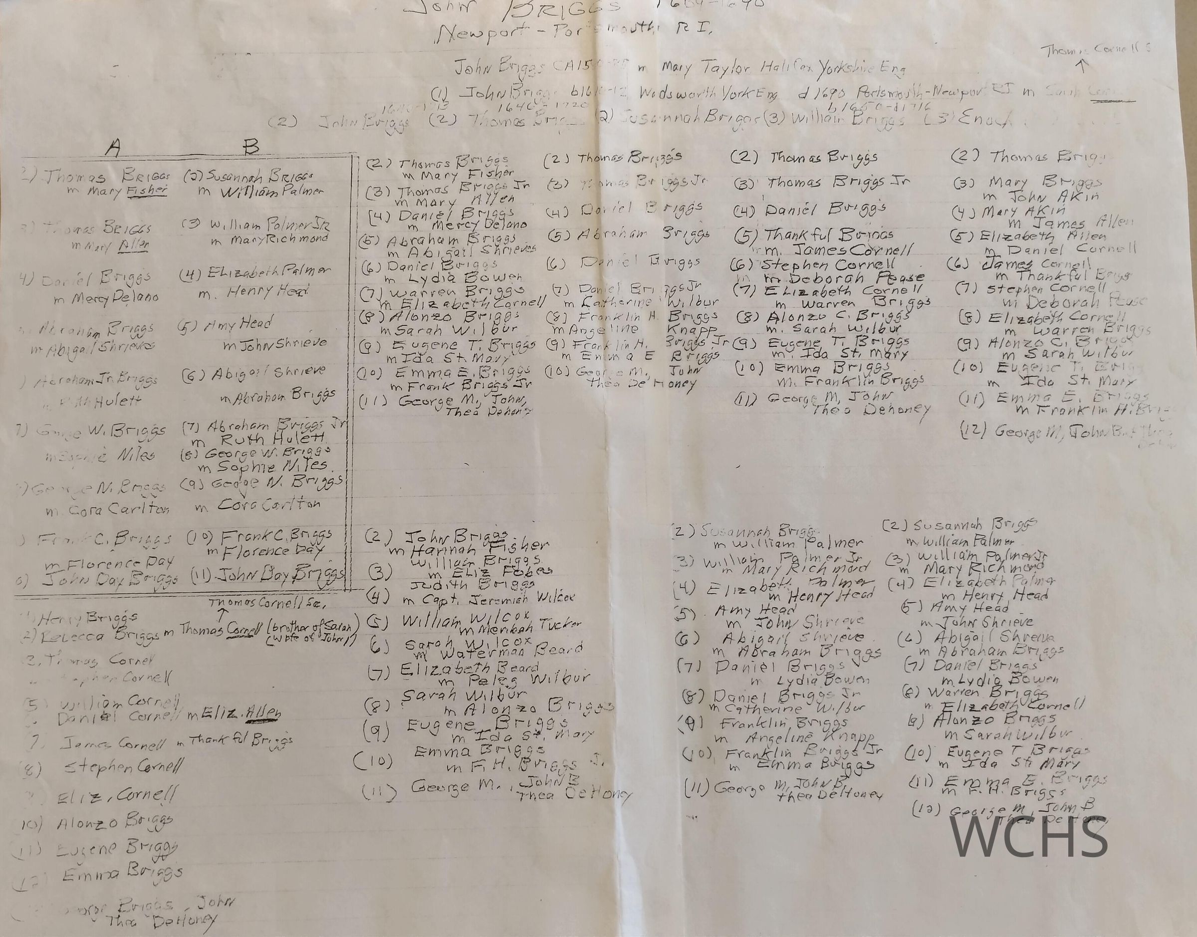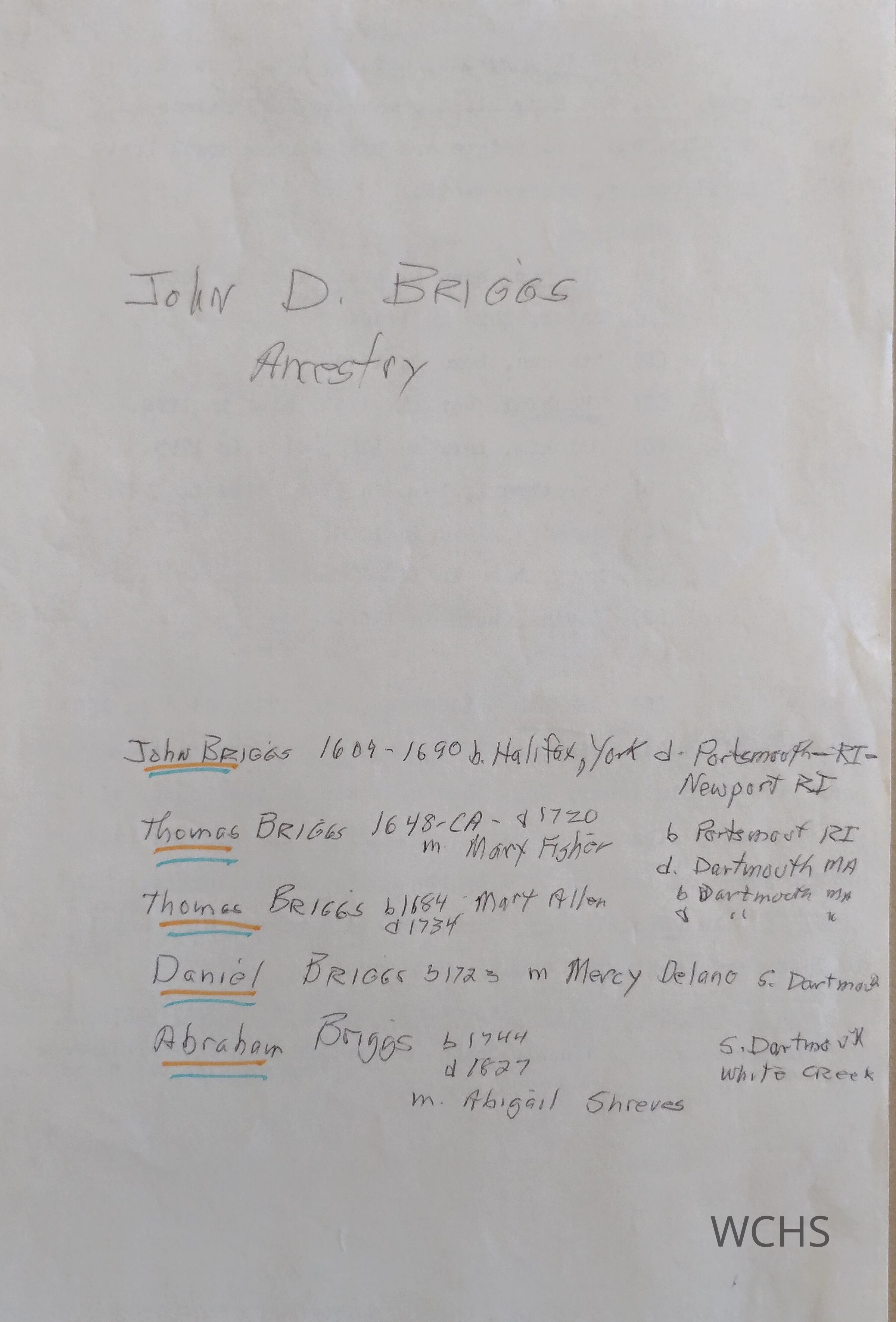 John D Briggs 1609 - 1690 Ancestry handwritten chart showing how many genealogical lines are descended from common ancestors