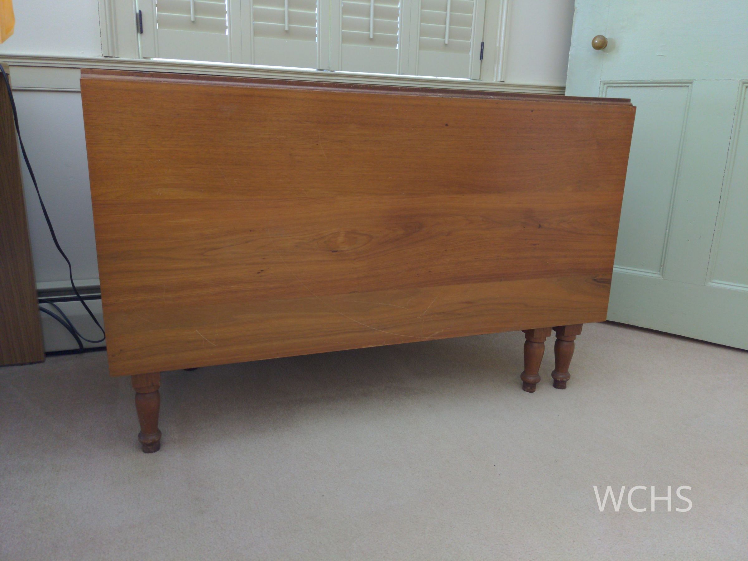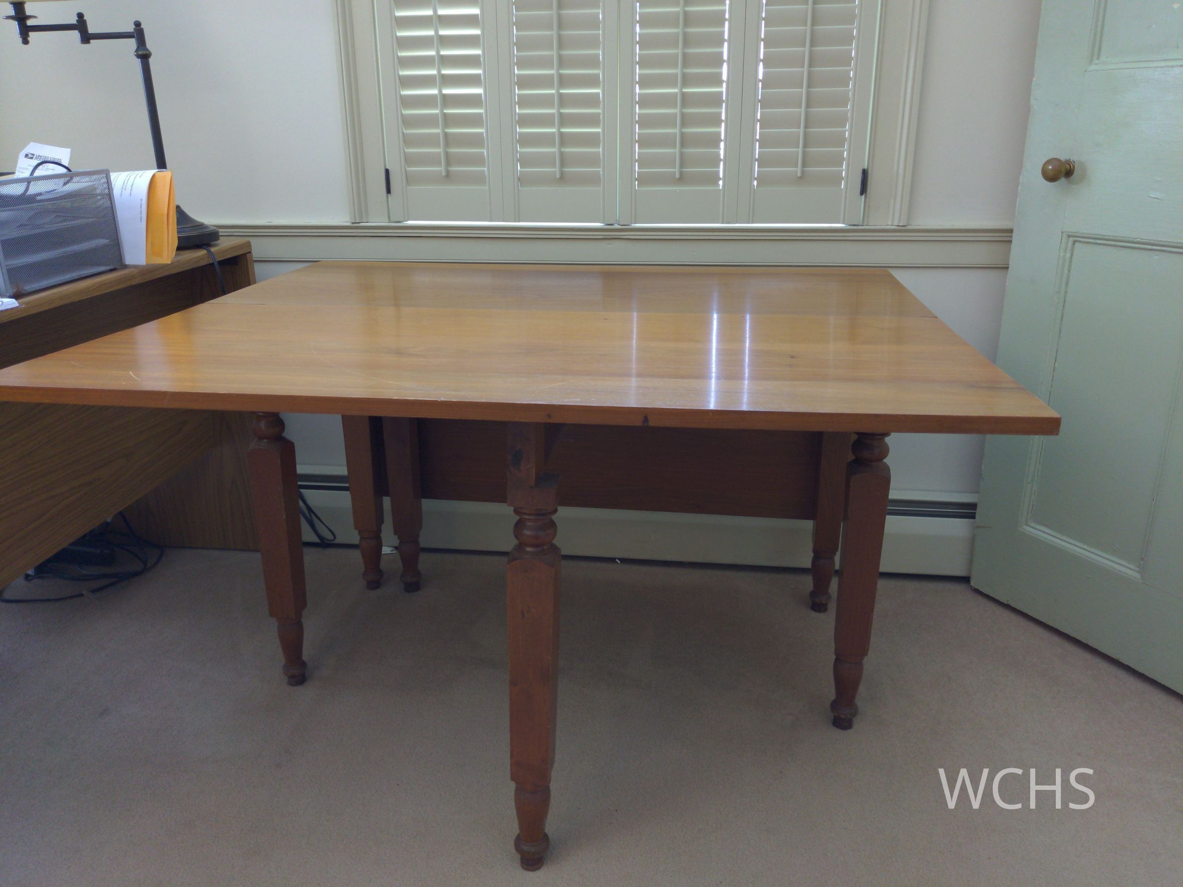 This drop-leaf cherry table was inherited by WCHS from the Charles Horuff estate. Cherry wood Top 18 1/2" X 45". Each leaf 21" X 45". 6 legs. Used in parlor and meeting room.
