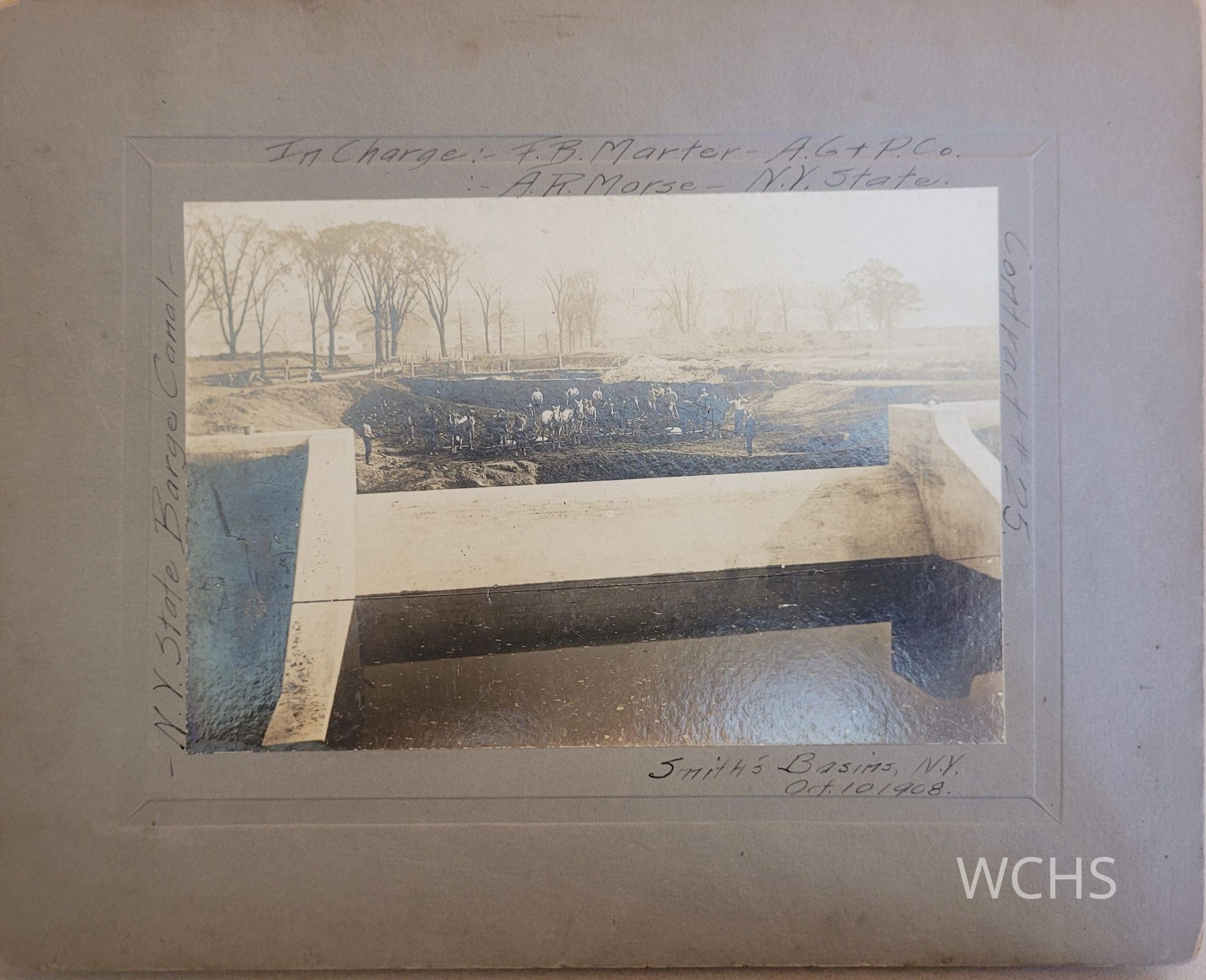 Marked: In Charge:- F.B. Marter, A.R. Morse AG+P Co. NYS, NY State Barge Canal, Smith's Basin, N.Y. October 10, 1908, Contract #25