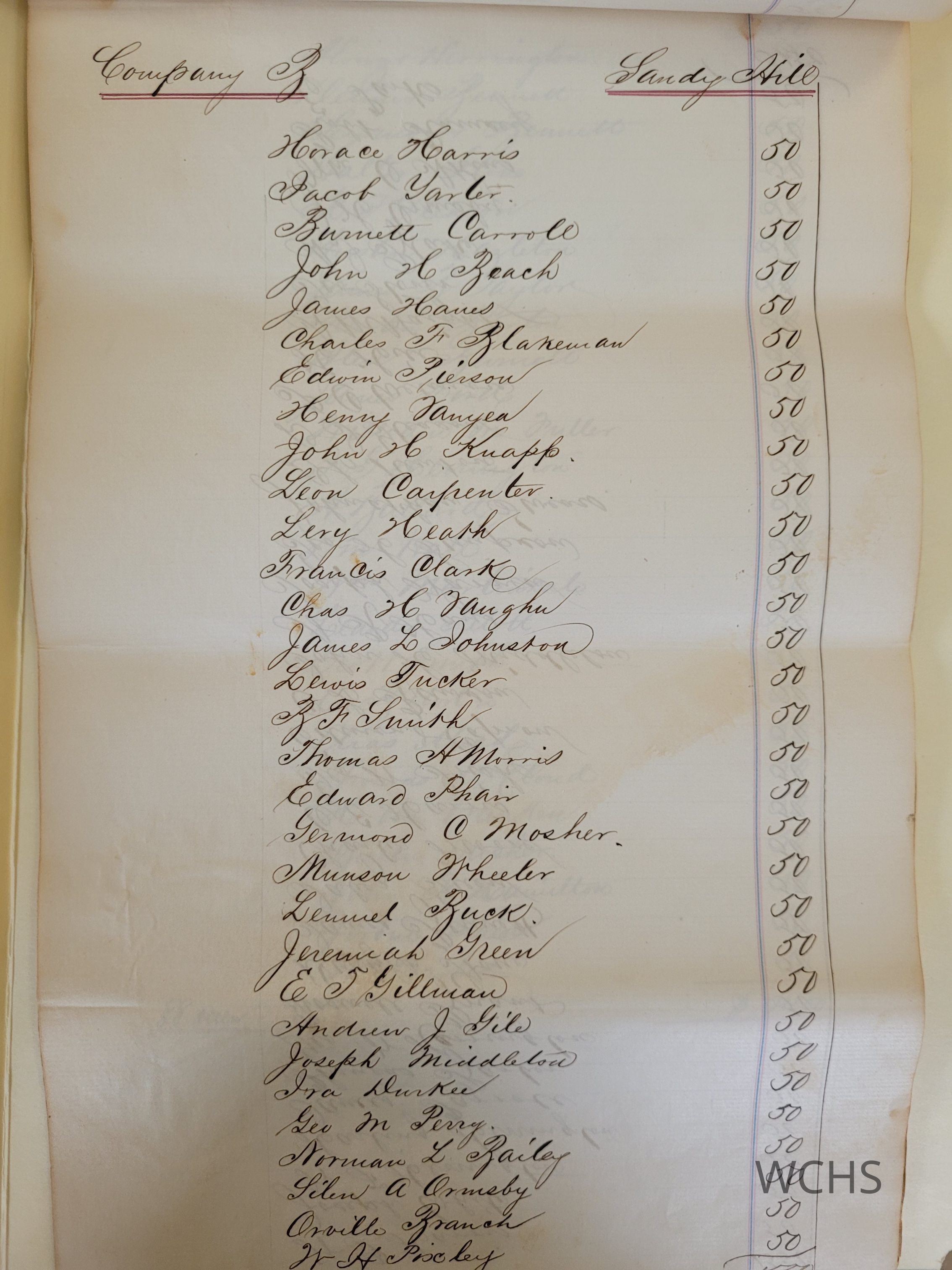 Bound with pink ribbon at the top, this 19th century document. List the names of the men who were due a bounty paid for their actions during the civil war. Organized by military company then alphabetized by last name. Written all in one hand.