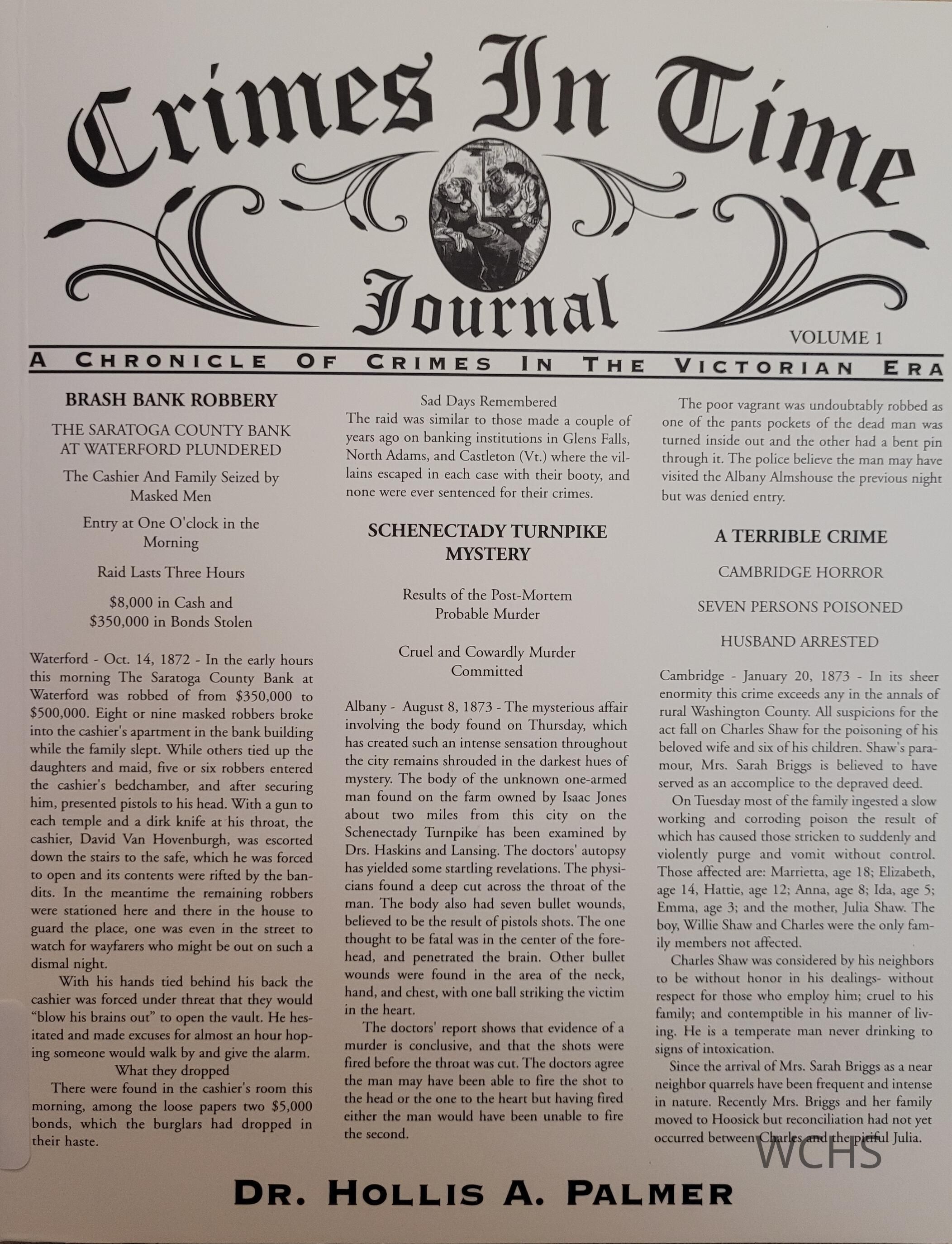 Crimes in Time Journal, Volume 1 by Dr. Hollis Palmer contains three major criminal cases. There is the story of the 1871 robbery of a bank in Waterford, in which the thieves stole $443,000 ($40 million today). The magnitude and audacity of the crime is only exceeded by the tale of what happens after. There is also the story of a mass murder in Cambridge, NY where five women from one family tragically died. It was called the most horrendous crime in the annals of the county. The other story is that of the murder of a one-armed man in Albany. No one knew the man and he was buried before he was identified. The attorneys involved in these cases earned recognition as some of the most outstanding trial lawyers of their day.