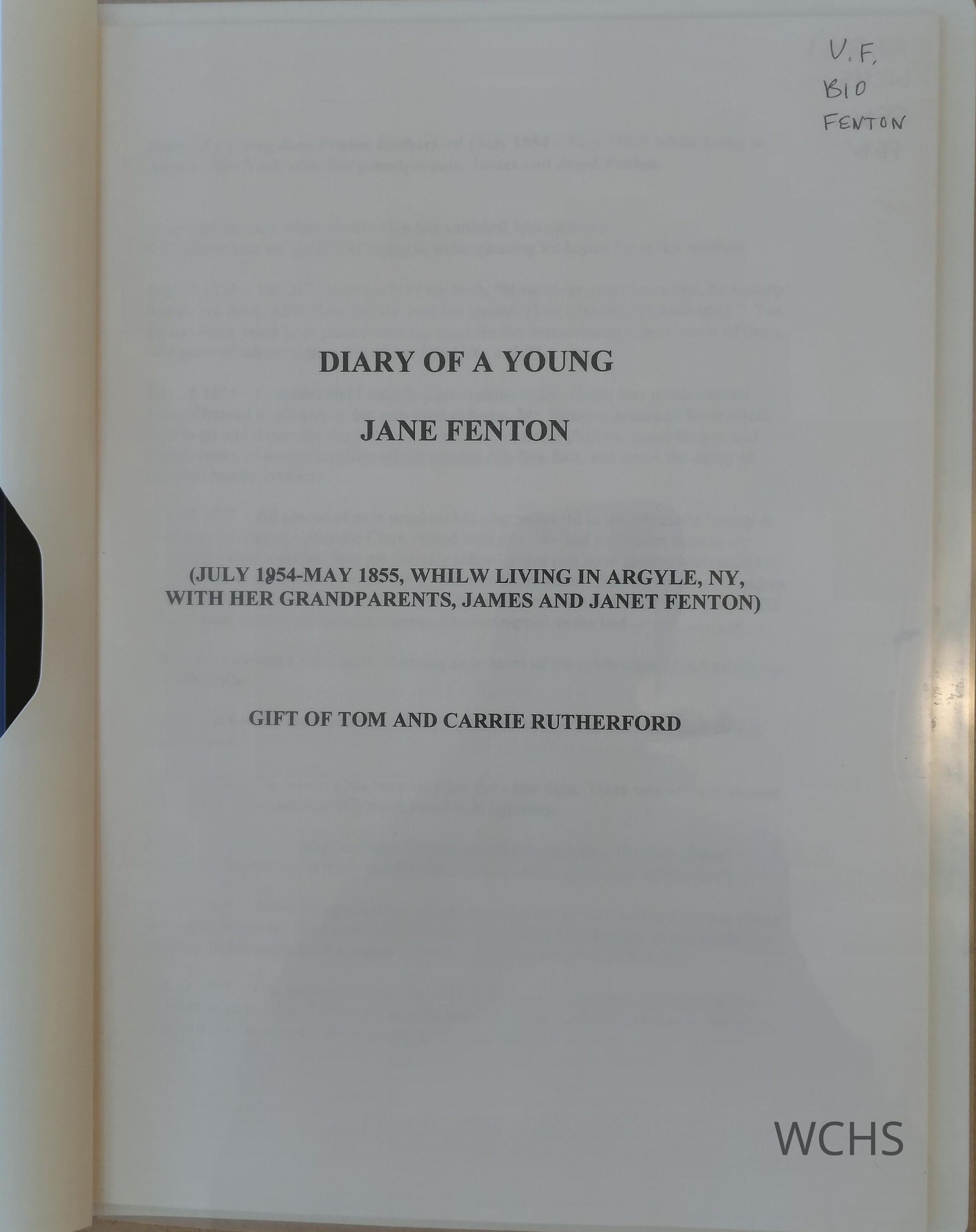 Diary Of a Young Jane Fenton (Rutherford), July 1854 to May 1855, While Living With Her Grandparents, James and Janet Fenton.Entry/Object ID