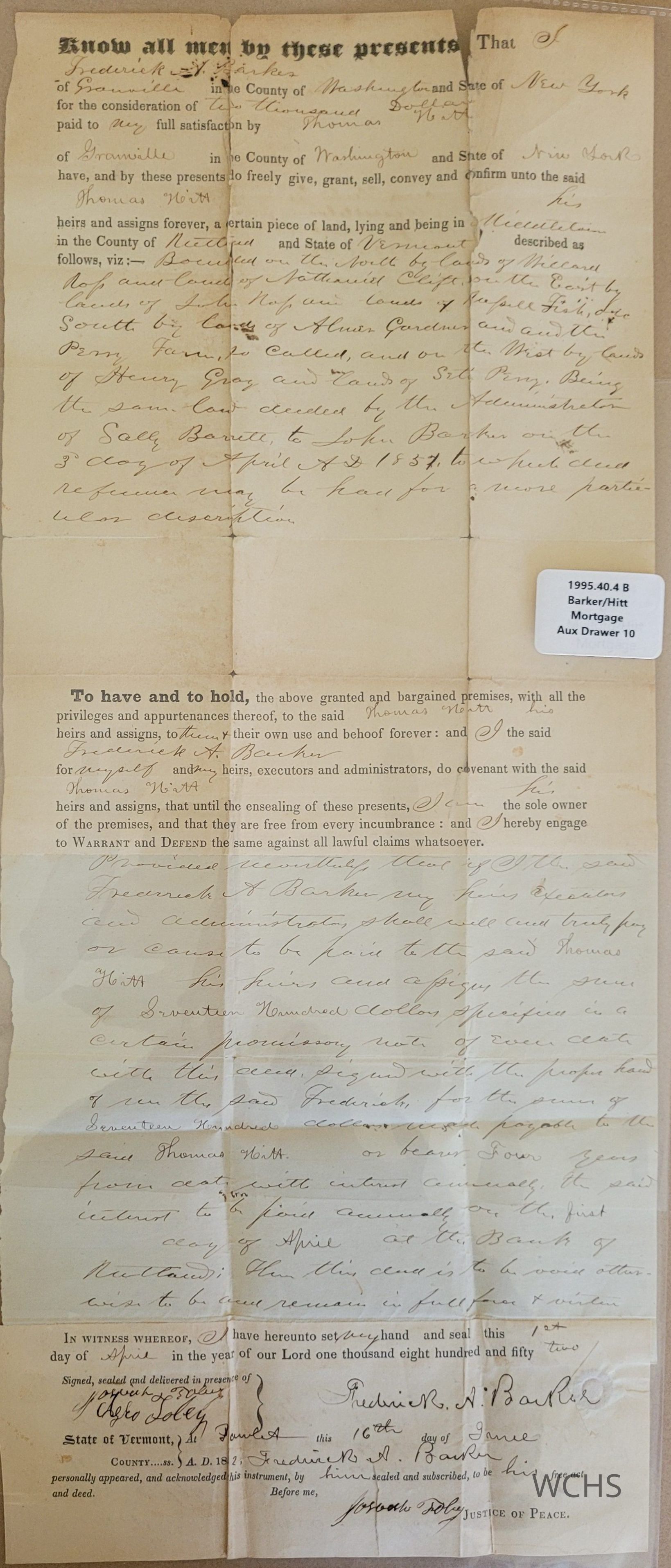(19)95.40.4 (B)- Mortgage between Frederick A. Barker and Thomas Hitt of Granville for a parcel of land located in Middletown, Rutland County, Vermont. Signed June 16, 1852