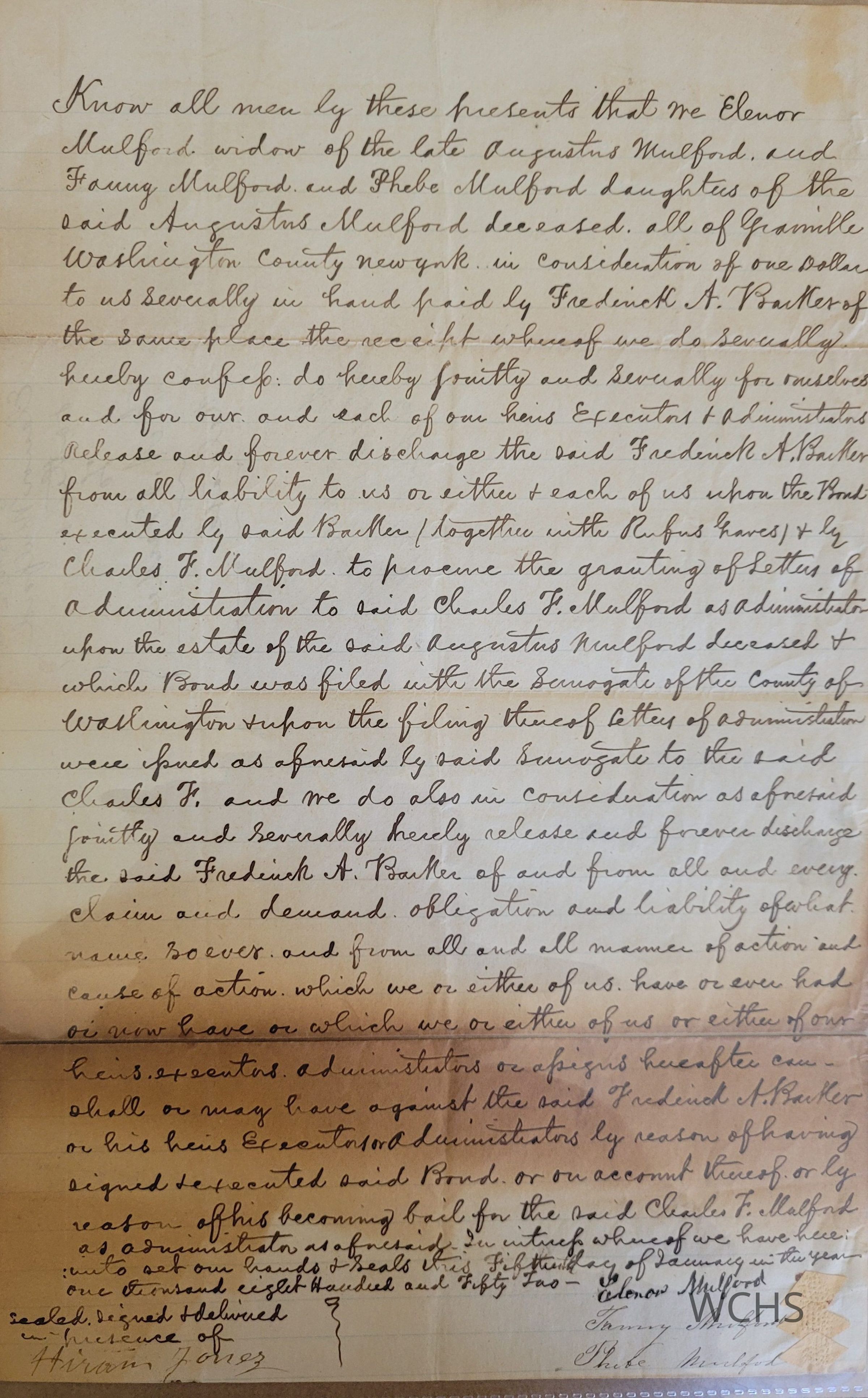 (19)95.40.4(A)- Release of dutys of Frederick A. Barker signed by Elenor Mulford ( widow of Agustus Mulford late of Granville) and her two daughters Phebe Mulford and Fanny Mulford. Signed January 15, 1852 and April 2, 1856