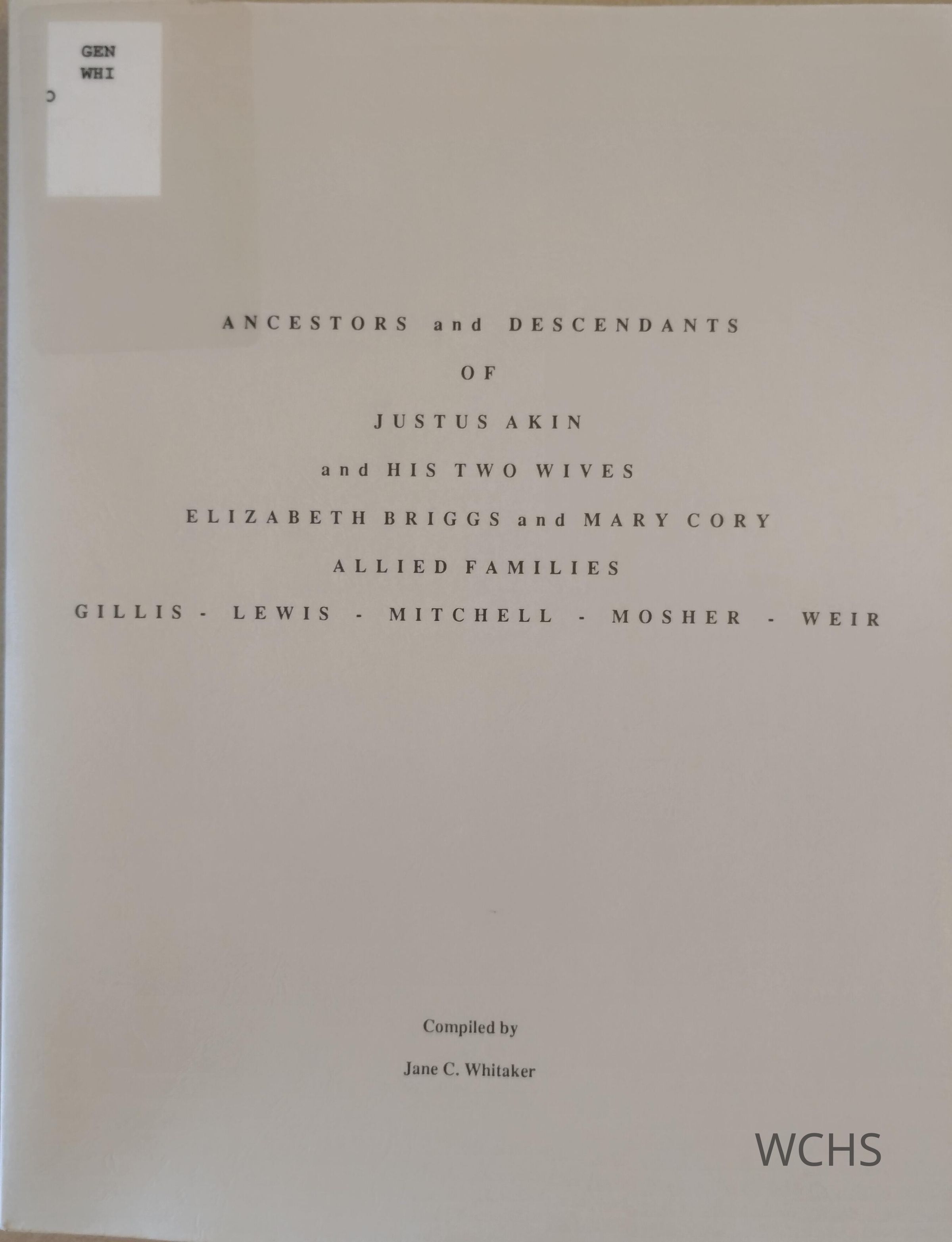 Ancestors And Descendants Of Justus Akin And His Two Wives, Elizabeth Briggs And Mary Cory; Allied Families - Gillis - Lewis - Mitchell - Mosher - WeirEntry/Object ID