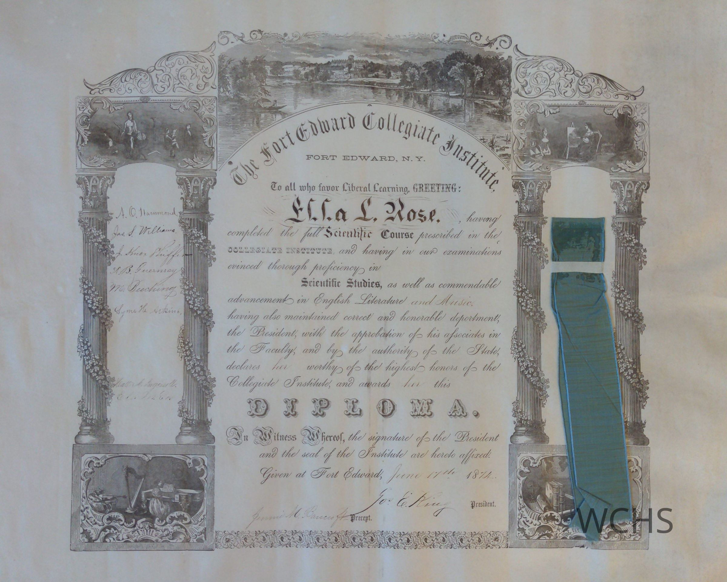This is Ella L. Rose's diploma from the Fort Edward Collegiate Institute in June, 1874. 18" X 24", cream paper with a green ribbon.