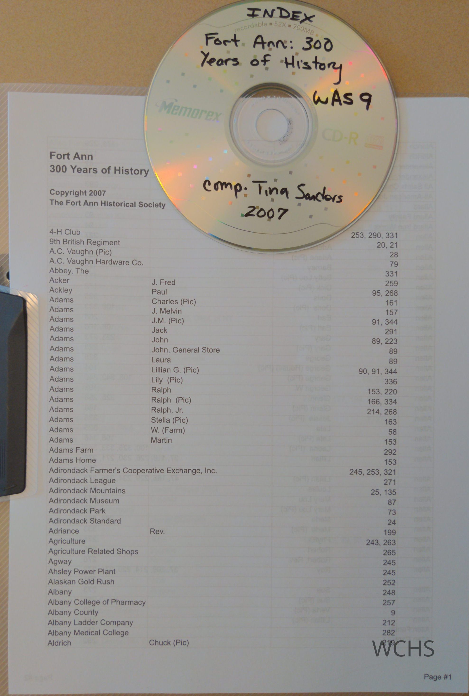 This index is to "Fort Ann: 300 years of History" by the Fort Ann Historical Society, indexed by Tina Sanders, copyright 2007. Stored with the book, Fort Ann: 300 Years of History.