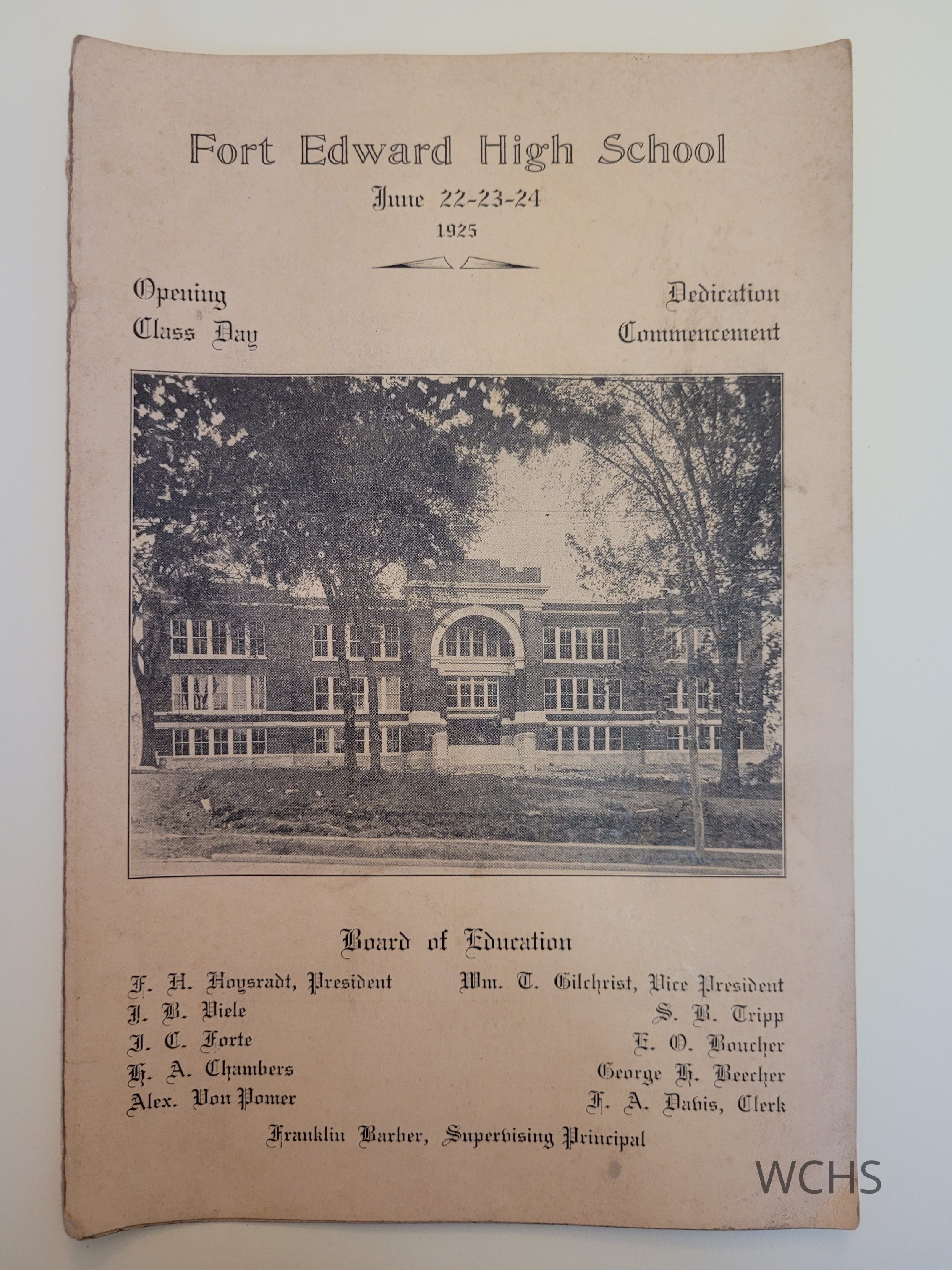 This program was given out at the dedication and commencement ceremony for the new Fort Edward High School Building in June 1925. Lists the timeline of the new building and contains members of the board of education as well as award recipients from the 1924-1925 school year.