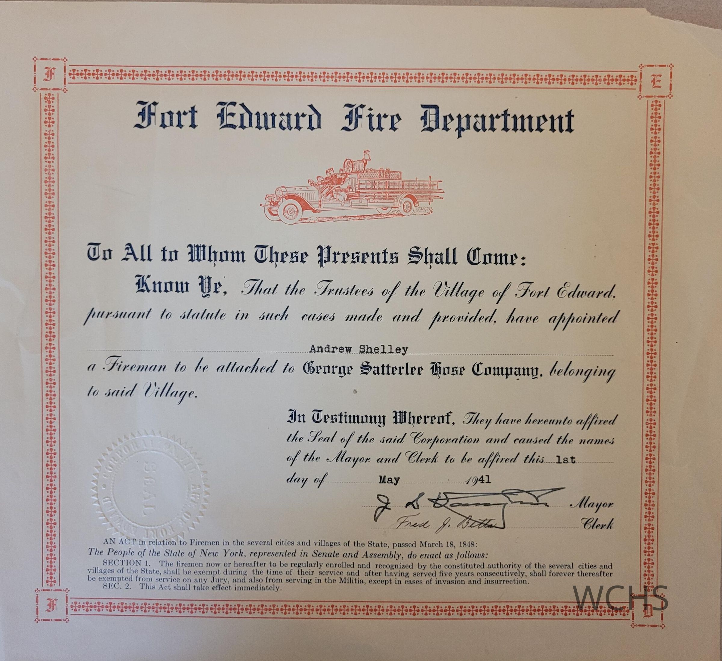 Appointee certificate of Andrew Shelley to the George Satterlee Hose Company of the Fort Edward Fire Department. Signed May 1, 1941