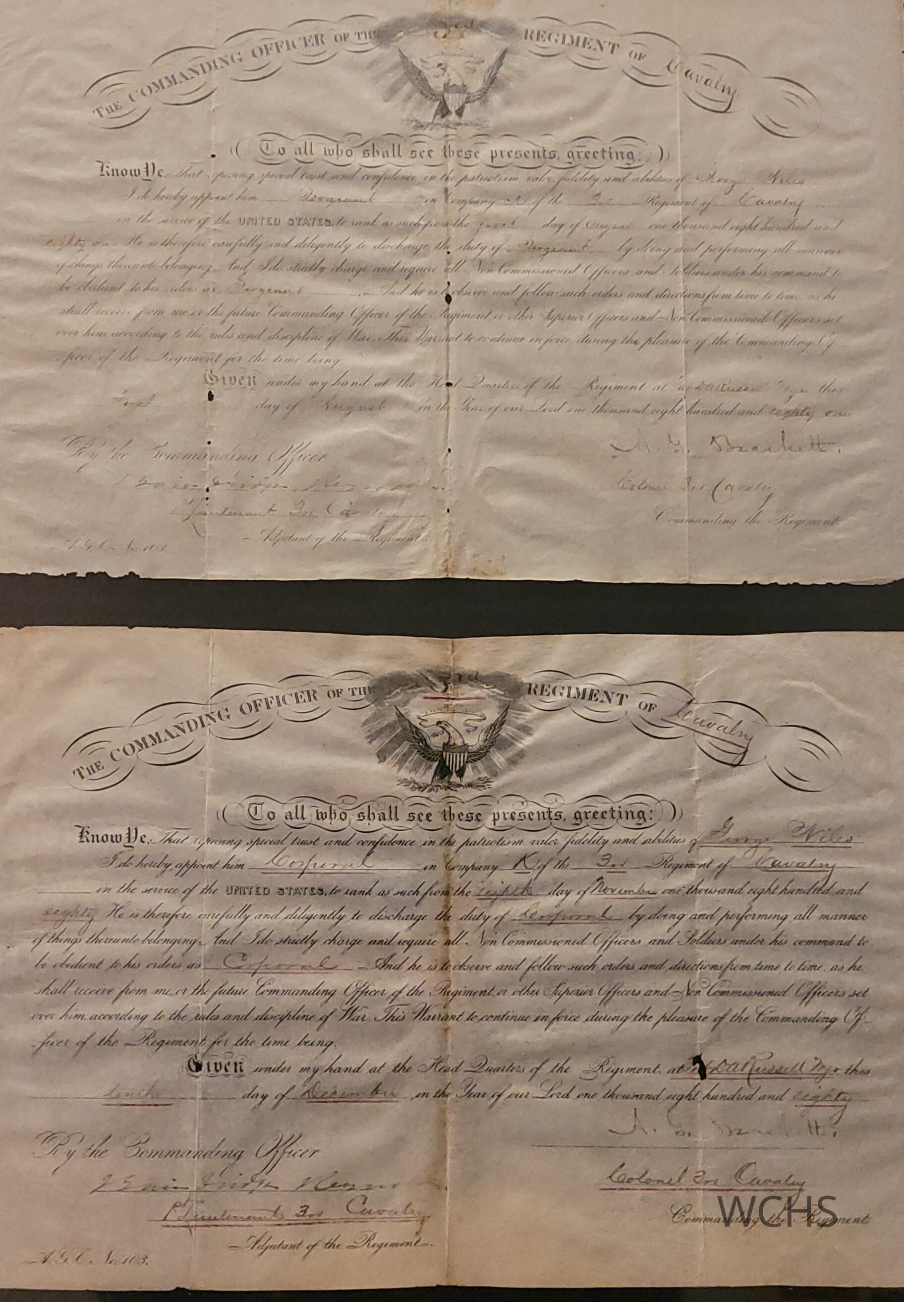 1st- Promotional papers for George Niles (born in Granville, NY) to the rank of Corporal. Serving in Company K, Third Regiment of the US Calvary initiated the eight day of November 1880
