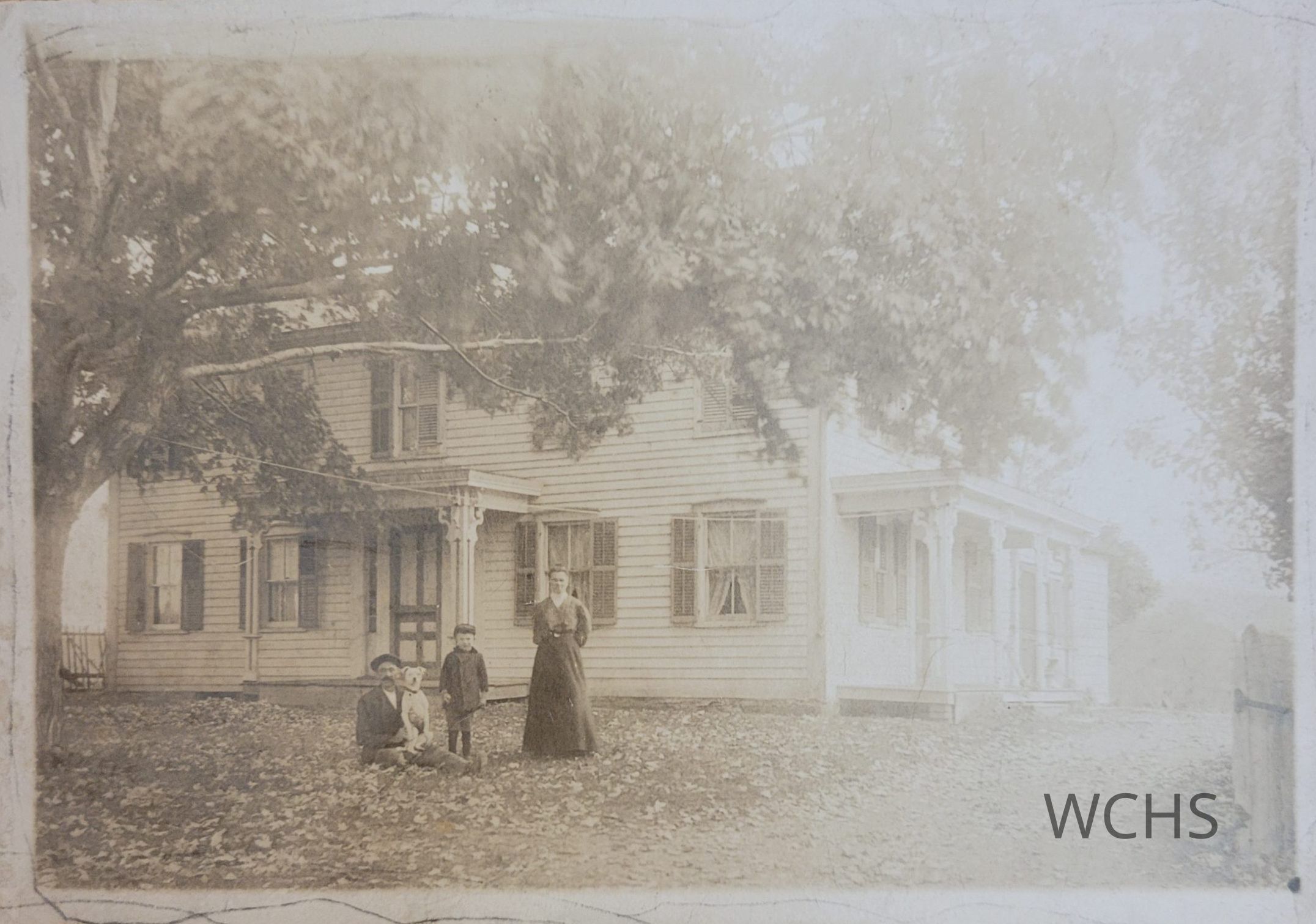 James and Ella Margurite (Herrington) and son, Welling Tinsler Gifford. They are seated in front of a home and have a dog with them.