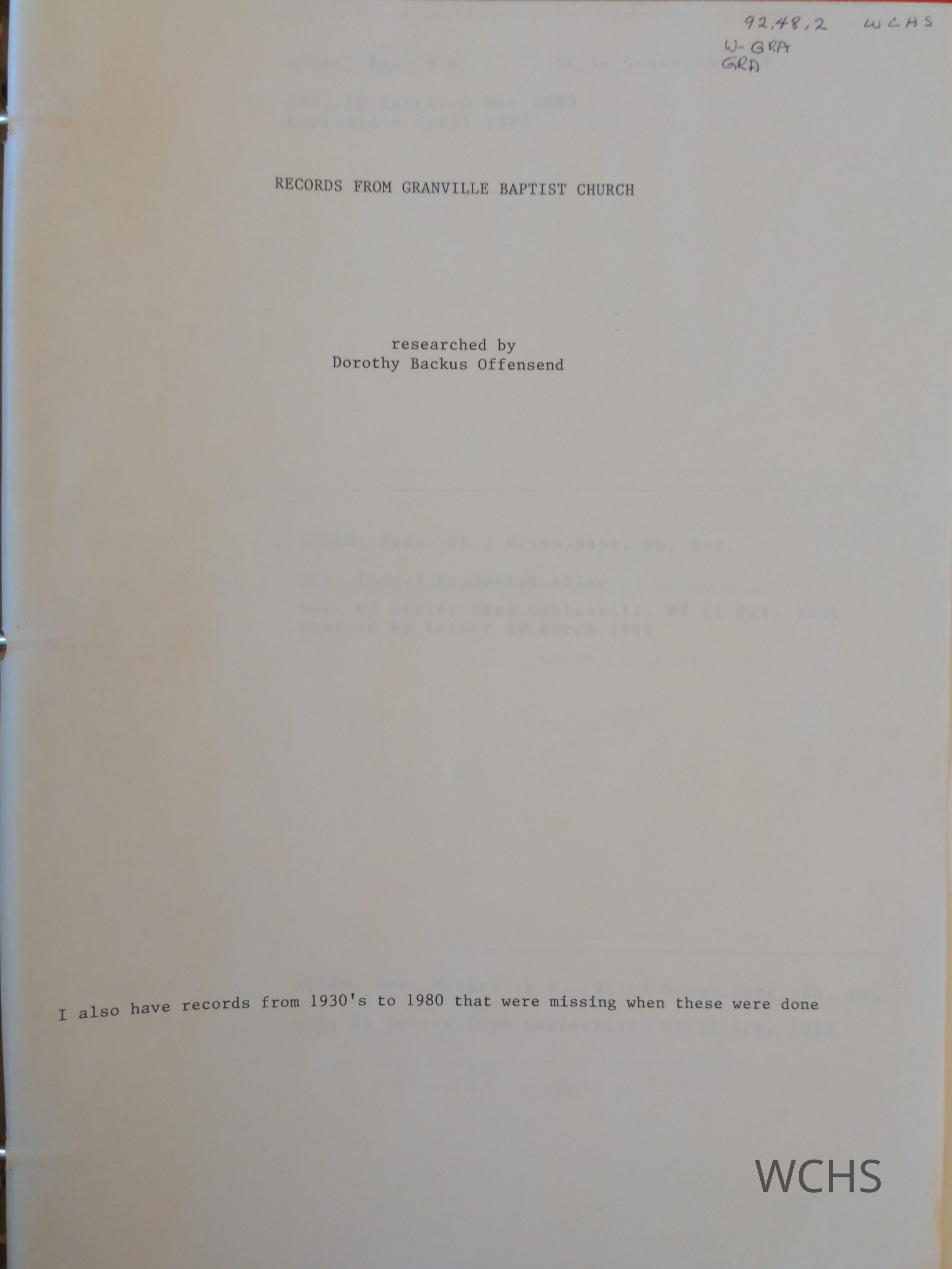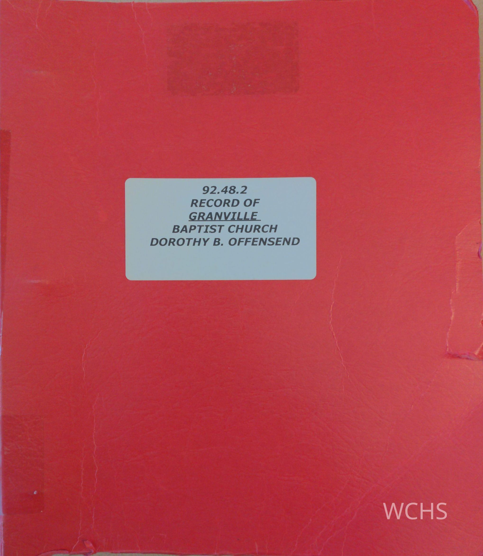 Alphabetical Records of the members of the Granville Baptist Church. Records from the 1930's to 1980's were missing when these were done. Complied by Dorothy Backus Offensend.Publication Details