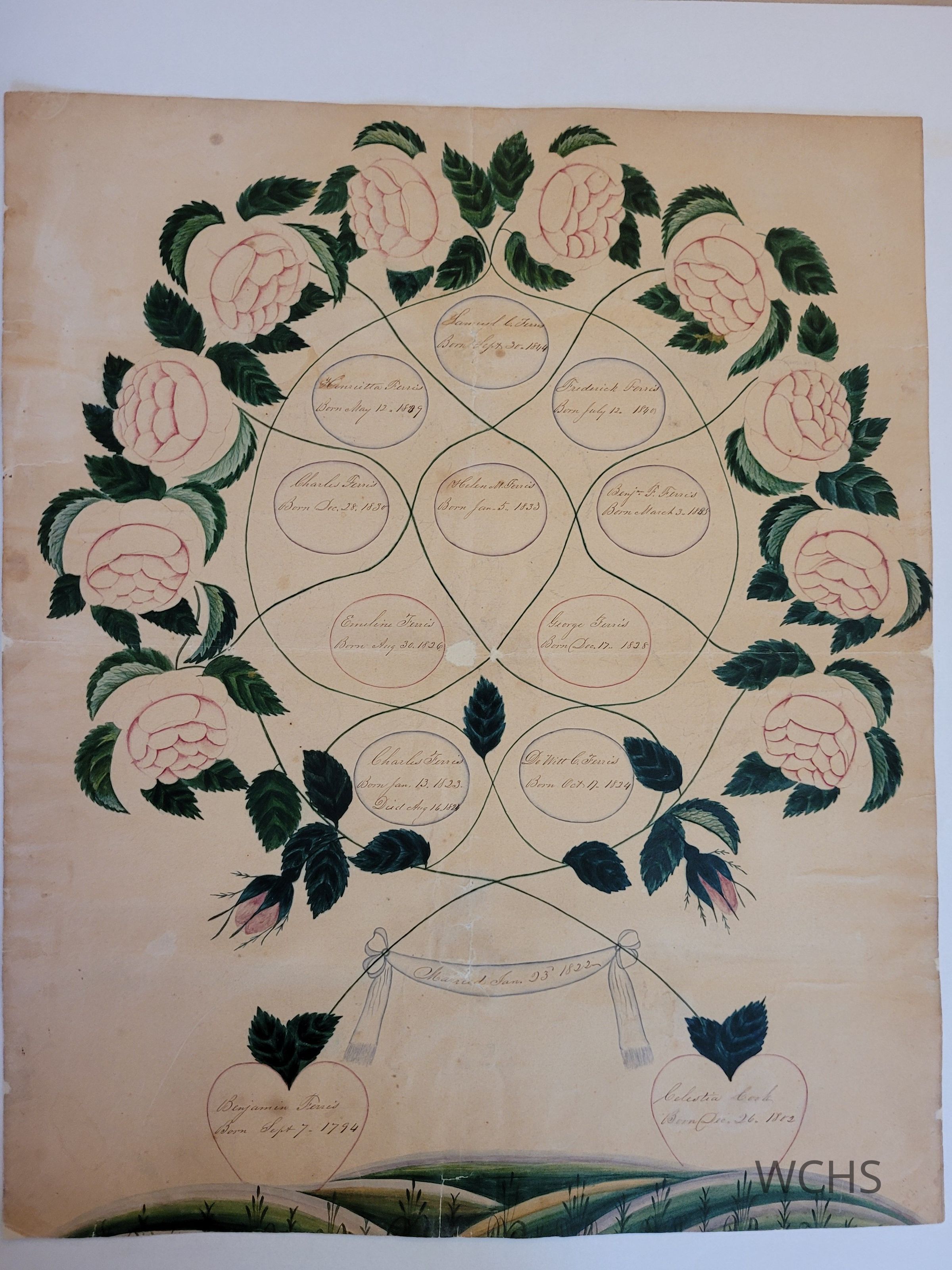 A hand-painted family tree showing the children of Benjamin Ferris (b September 7, 1794) and Celestia Cook (b December 26, 1802) married Jan 23, 1822. Their ten children were Charles, DeWitt, Emiline, George, Charles, Helen, Benjamin, Henrietta, Frederick, and Samuel.