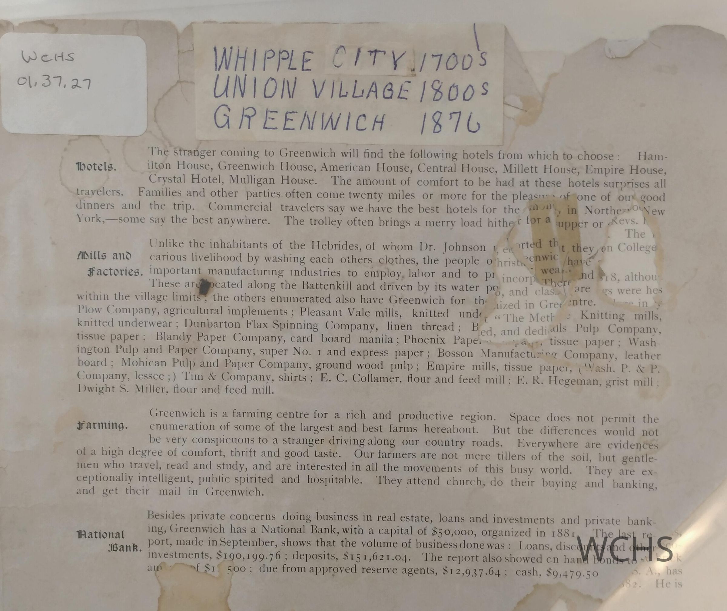 A history of Greenwich, NY, unknown publication date. Briefly describes hotels, churches, industries in the area. Bulk of the publication is pictures of hotels, churches, industries, views, residences and streets, both village and town.