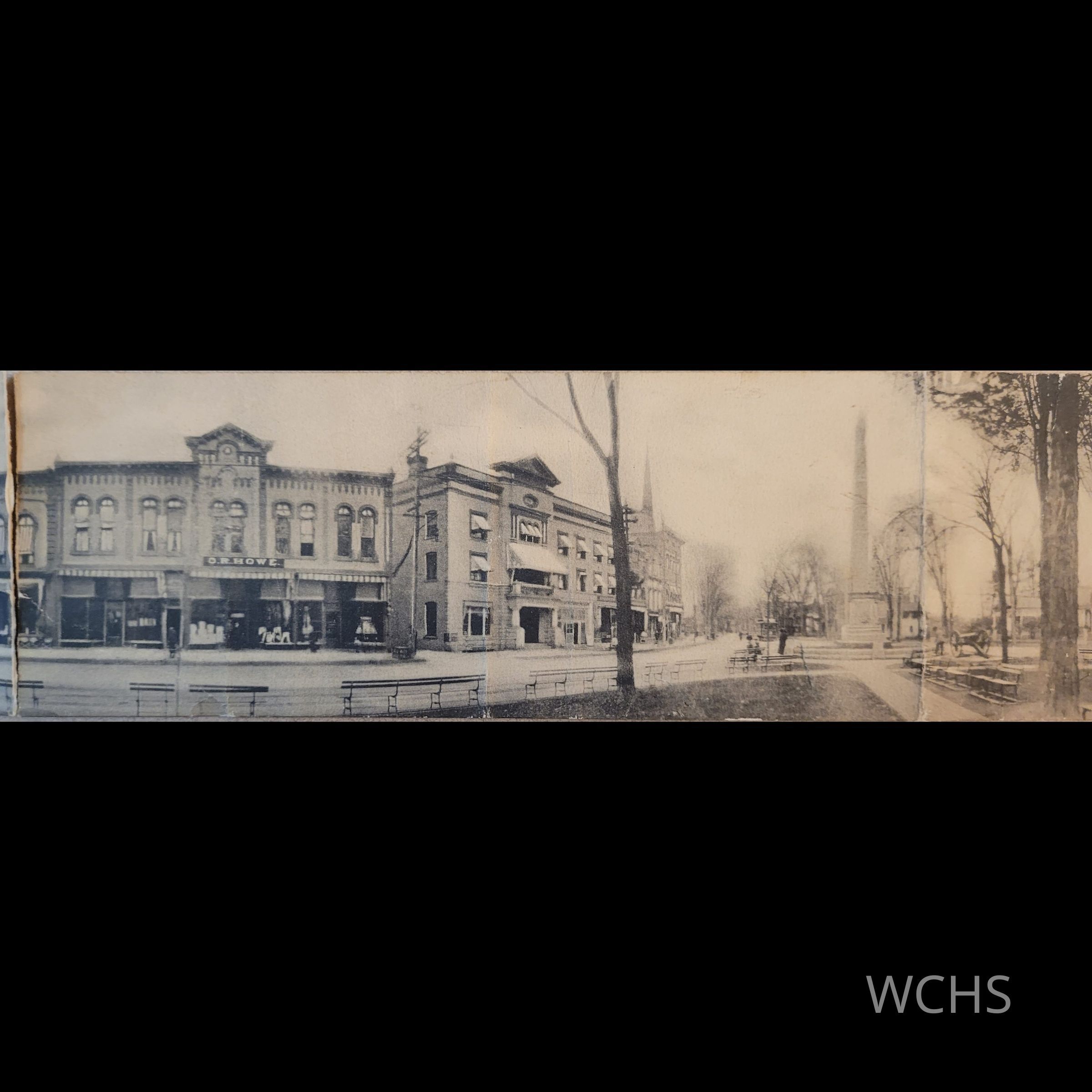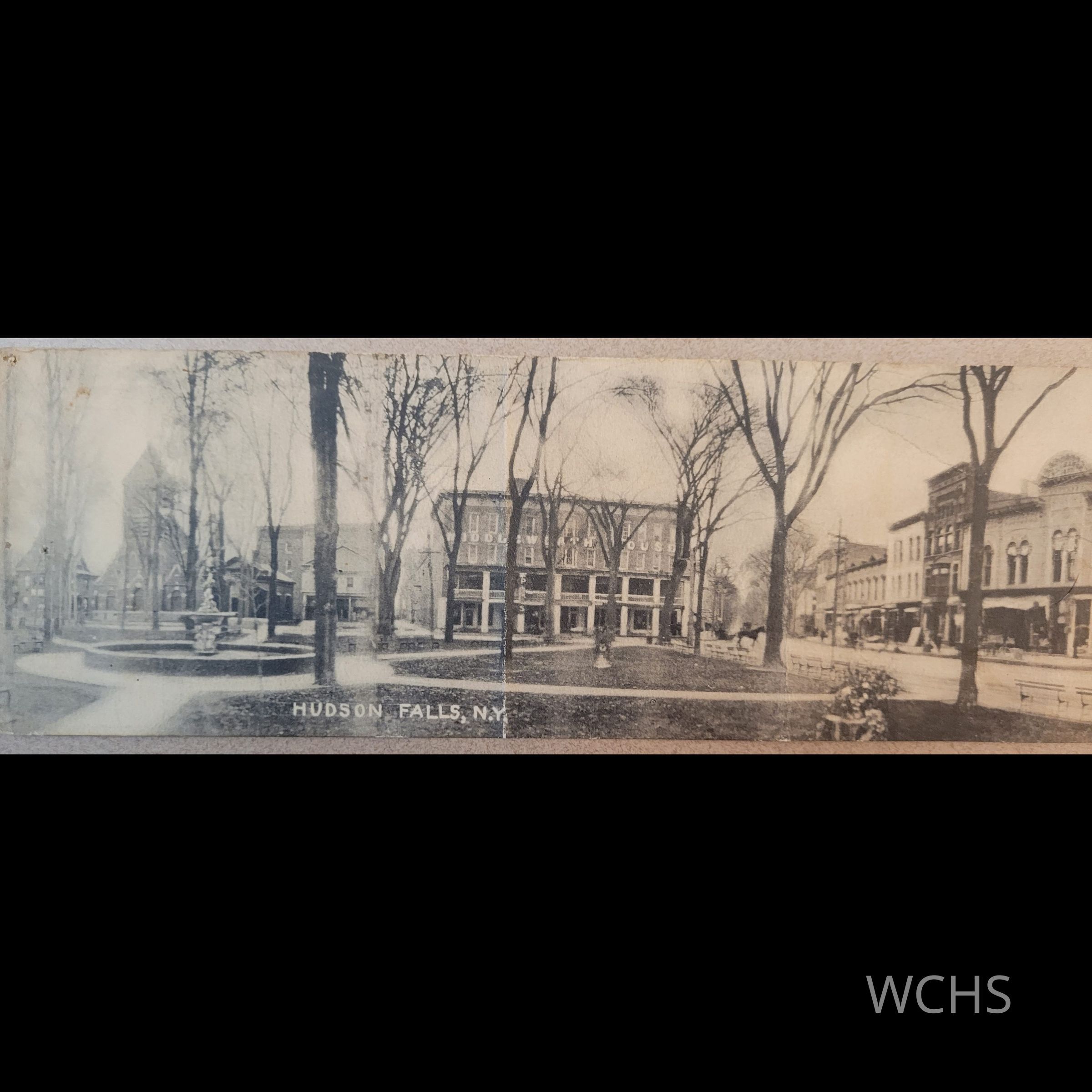 A panoramic postcard of Hudson Falls, NY. Originally this item would have measured 20.5 inches but overtime has split into 2 pieces. This postcard dates after May 1910 when Sandy Hill village residents voted to change their name to Hudson Falls.
