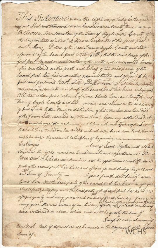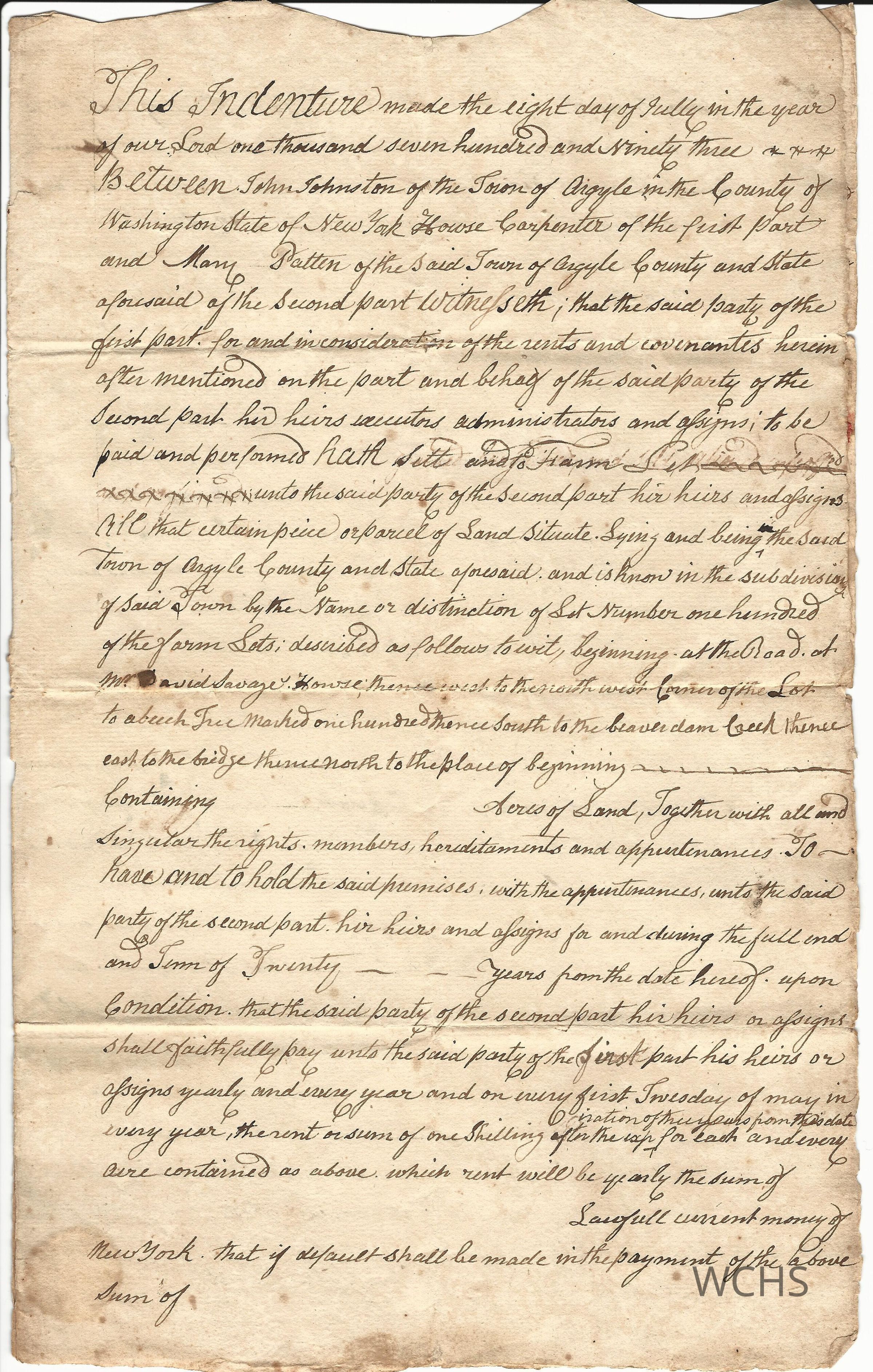 John Johnston Mary Patten Indenture--1791 Argyle (NY)--Document