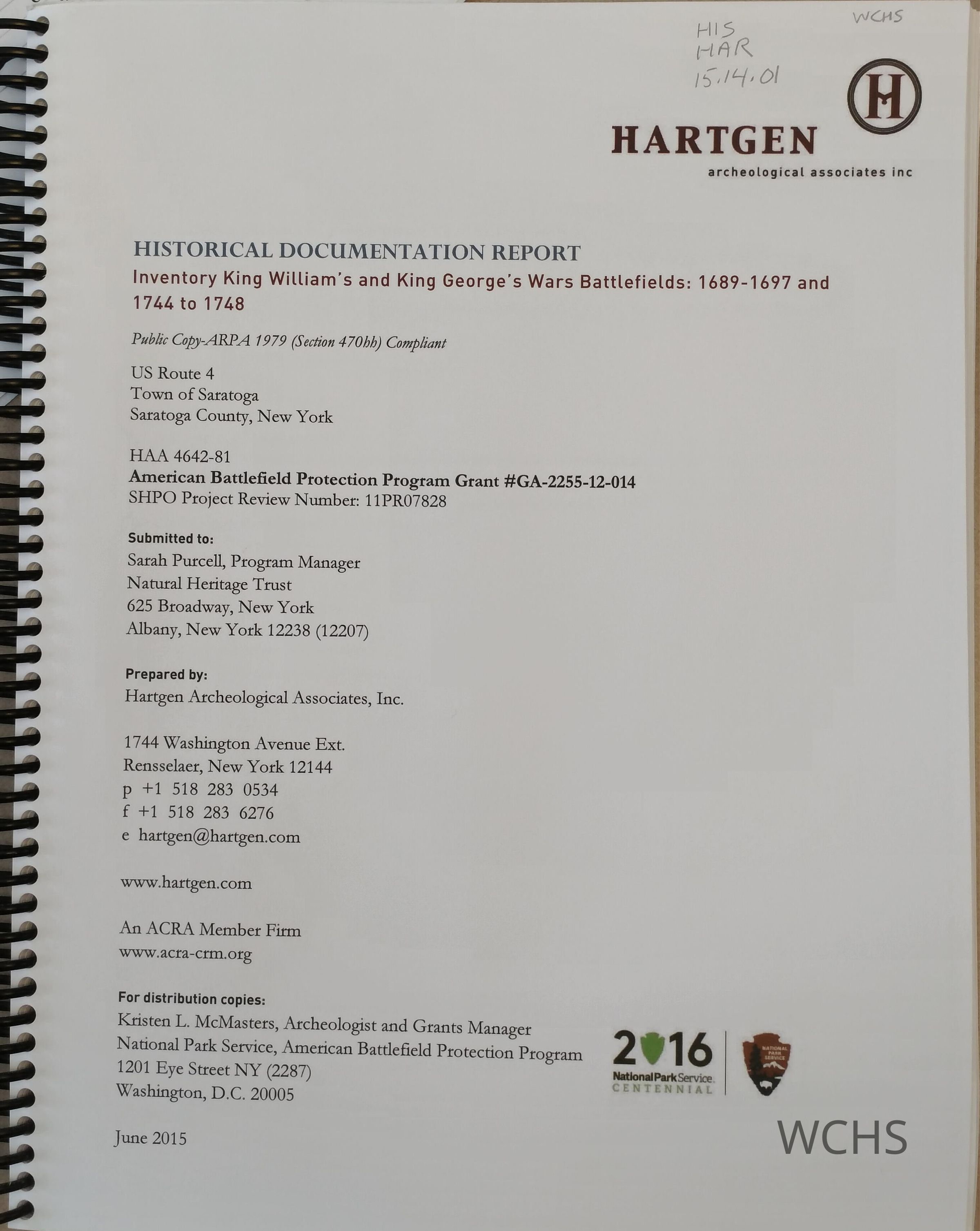 Historical documentation and archeological inventory focused on the area just south of Fish Creek, along the Hudson River in the town of Saratoga, mainly concerning two colonial wars: King William's War (1687-1698) and King George's War (1744-1748).