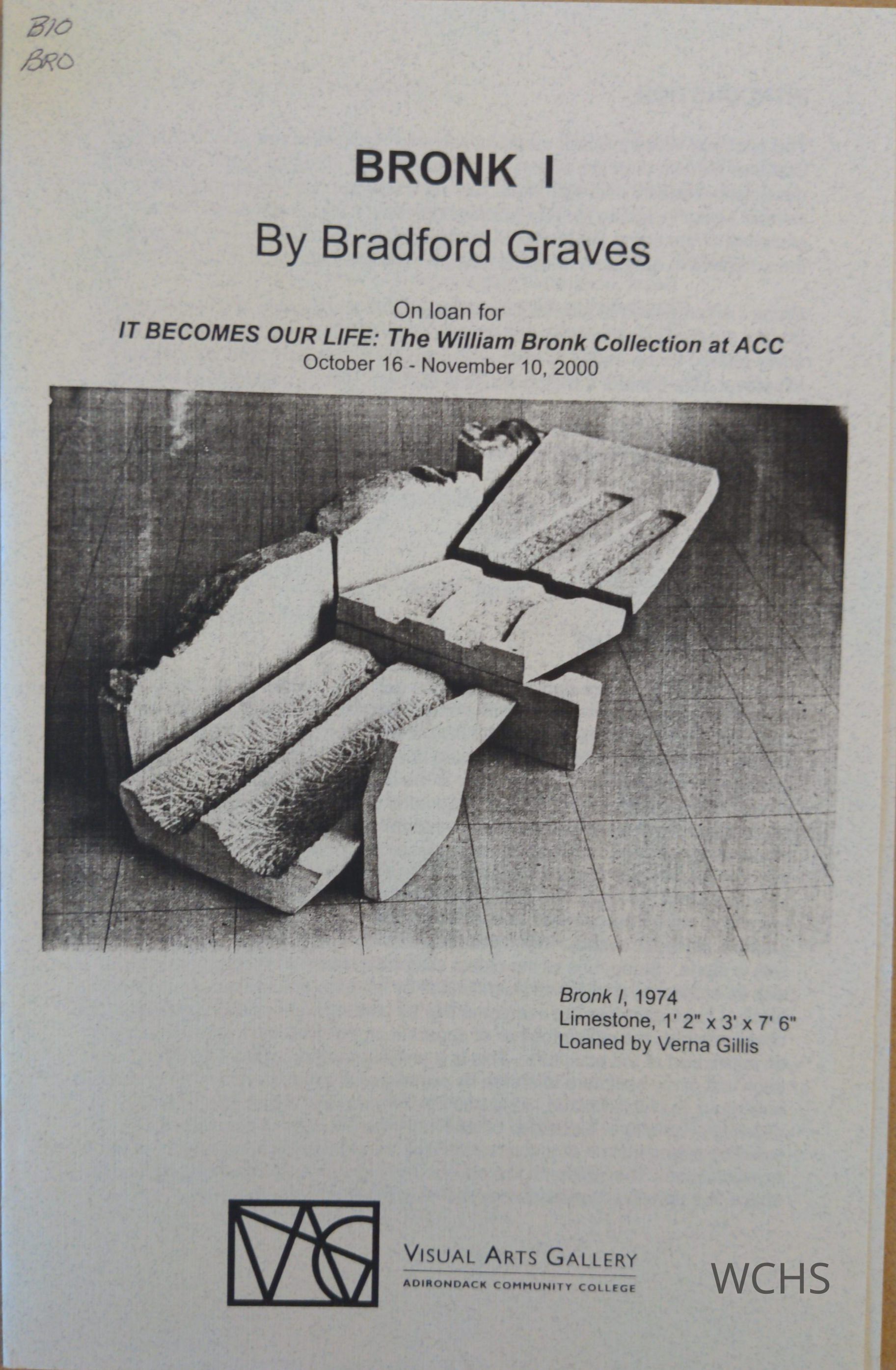 Works by William H. Bronk of Hudson Falls. This includes two brochures - "Fete" by Richard Carella and "Bronk 1" by Bradford Graves.