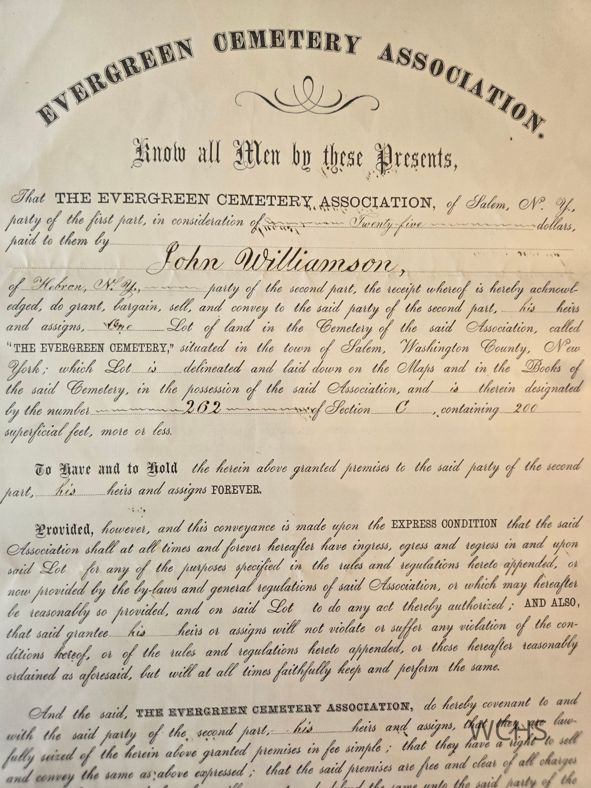 Document outling the purchase of lot 262 section C of the Everegreen Cemetery by Hebron farmer John Williamson. Purchased August 27, 1872 and signed on behalf of The Evergreen Cemetery Association by president Asa Fitch and treasurer Benjamin F. Bancroft.