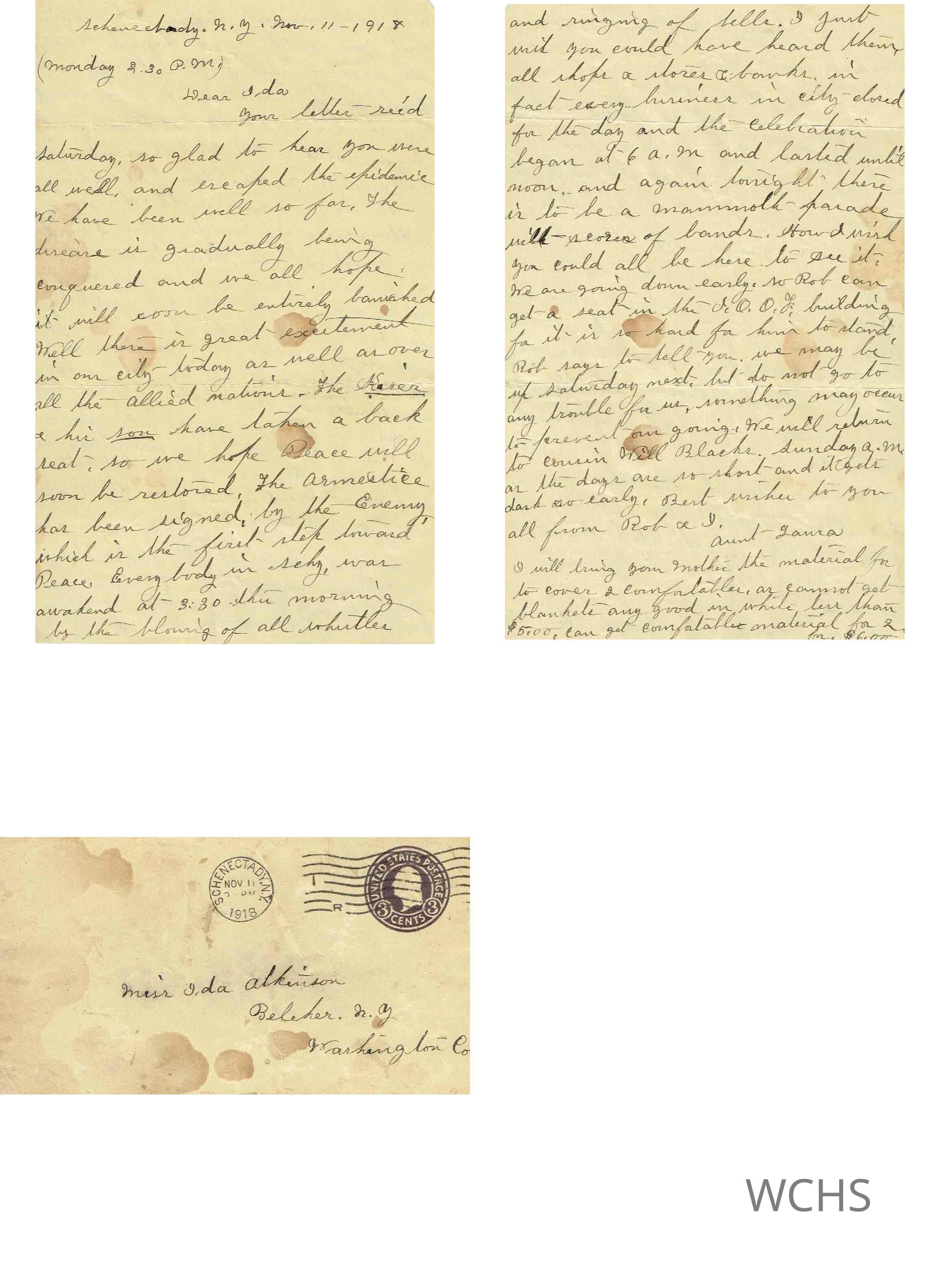 Letter written to Ida Atkinson of Belcher, NY from her Aunt Laura of Schenectady discussing Armistice Day and the Spanish Influenza. November 11, 1918