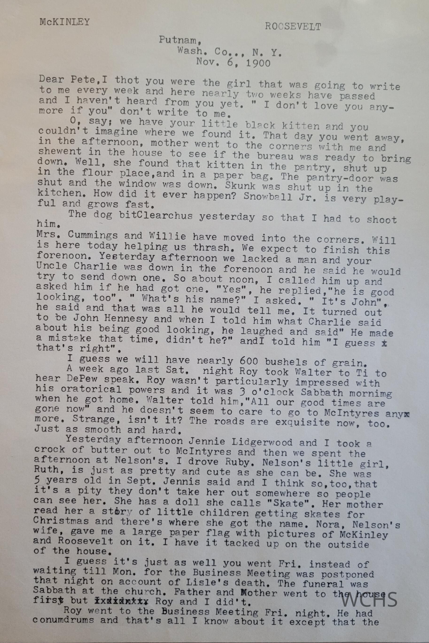 Collection of 35 (transcribed) letters written by Lulu Lidgerwood Sears of Putnam, NY. sent to her childhood friends Elizabeth "Bess" (nicknamed Pete) and Lois Paterson. The first letter is written in 1899 and the last being 1918/1919. Lulu attended Gloversville High School and then Cornell University all the while visiting her home farm in Putnam. The letters contain many references to fellow residents of Putnam, NY.