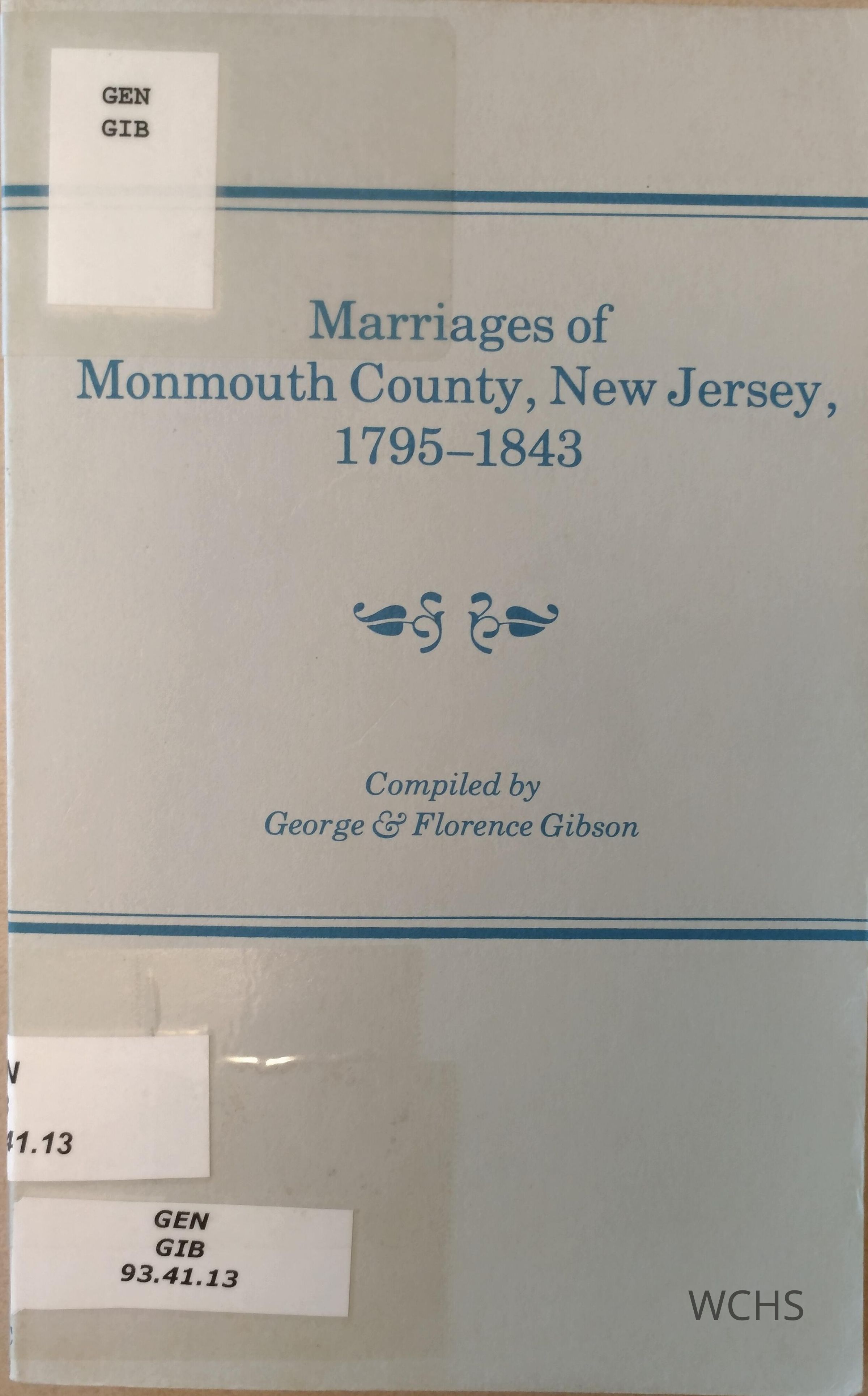 Marriages Of Monmouth County, NJ. Index is wife's surname; body of book is alphabetical by husband.Publication Details