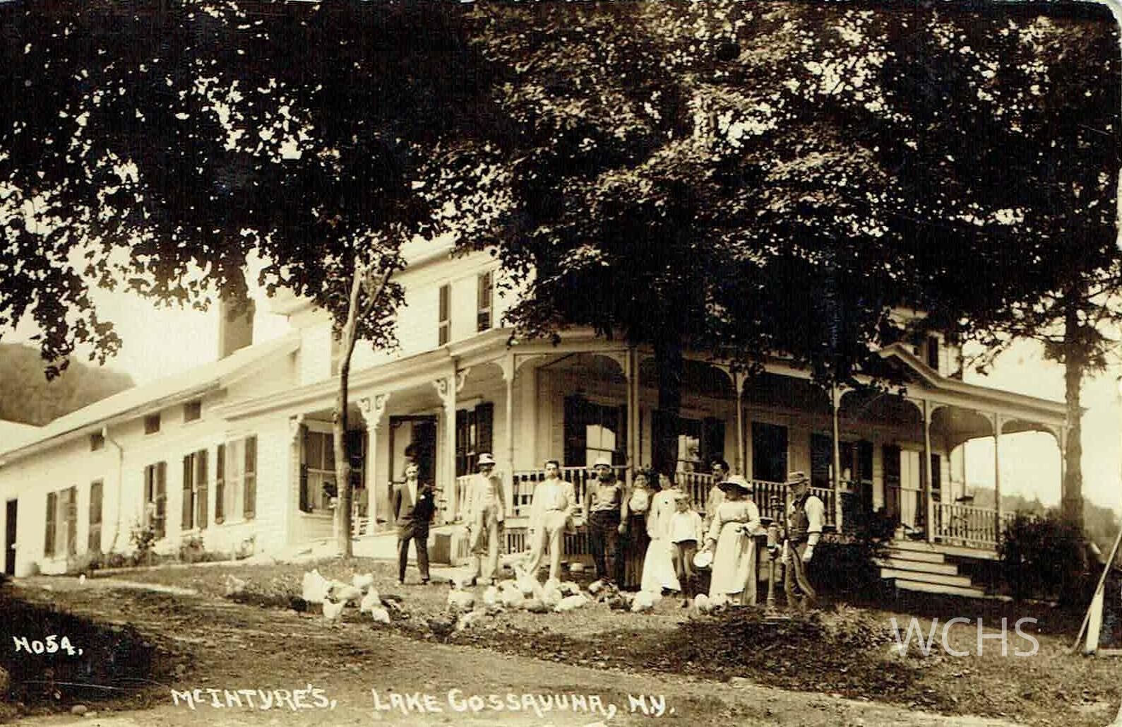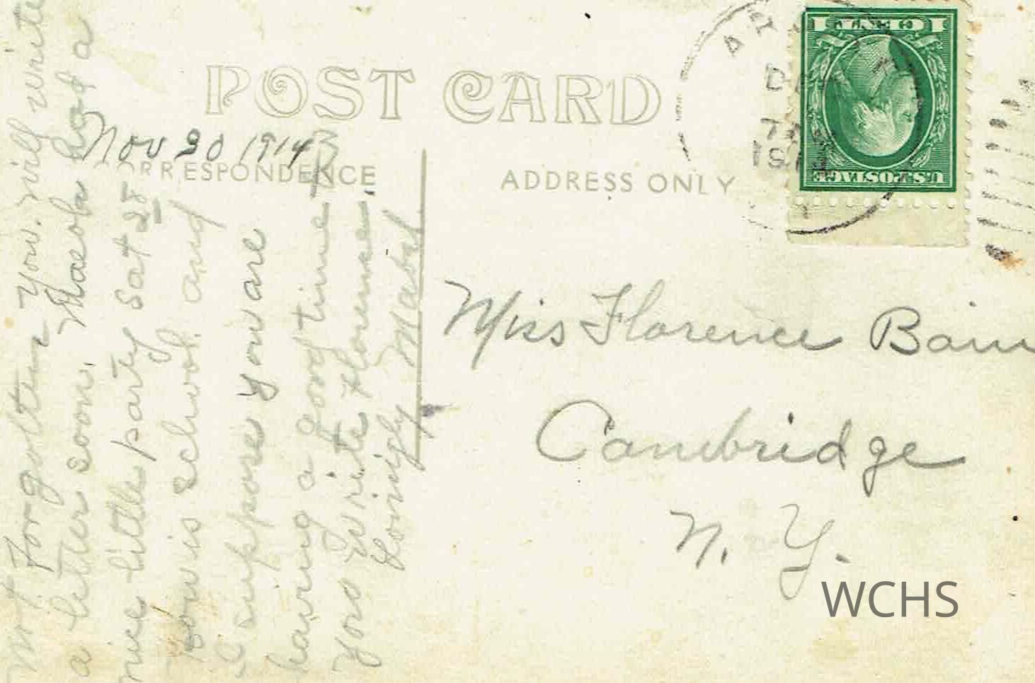 Postcard from 1914 featuring McIntyre's Family Home at Cossayuna Lake. Sent to Miss Florence Bain of Cambridge, NY