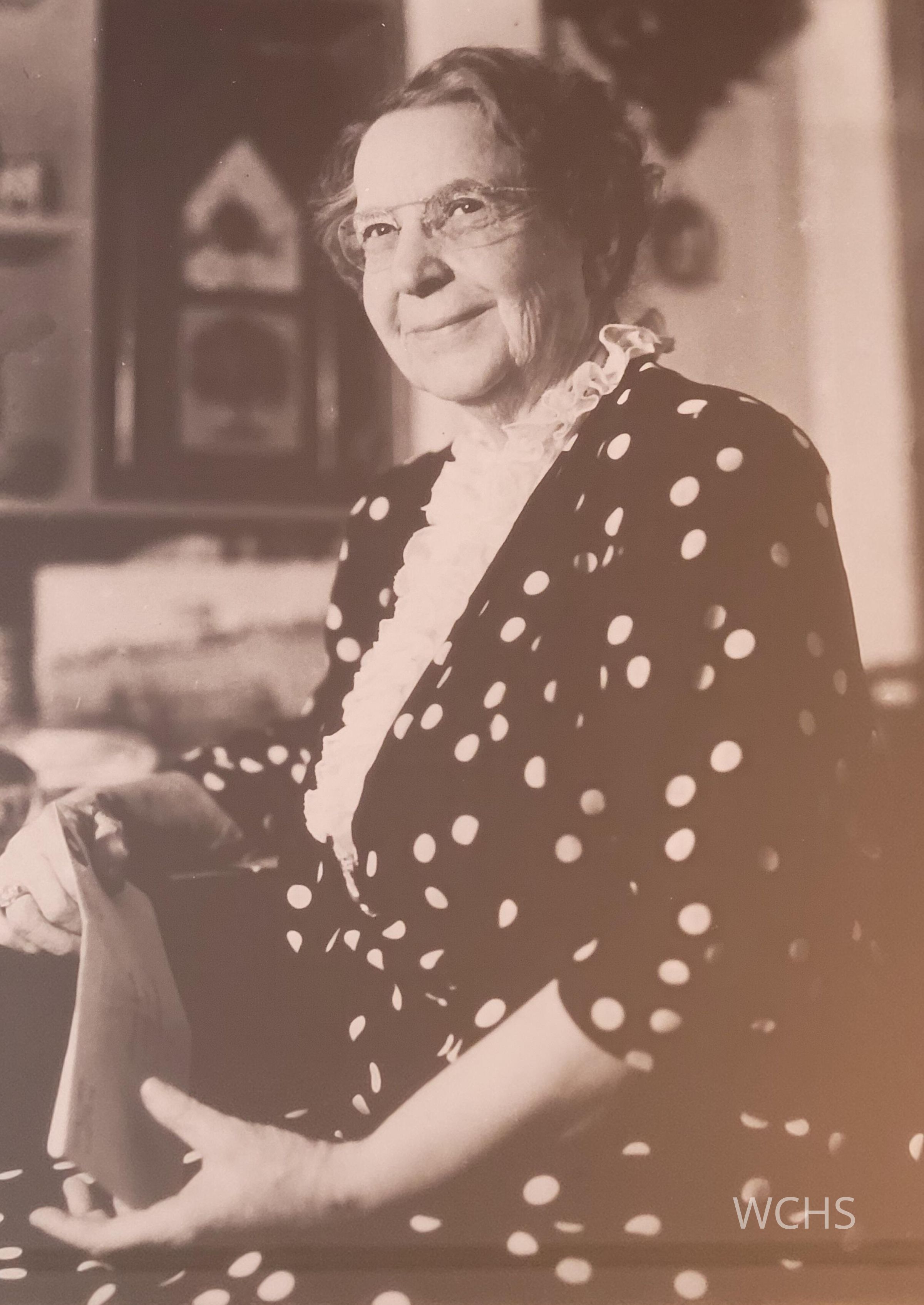 Sue Wade, founder of Washington County Historical Society 1940 B & W photo, 12" X 15" in frame, located on meeting room wall
